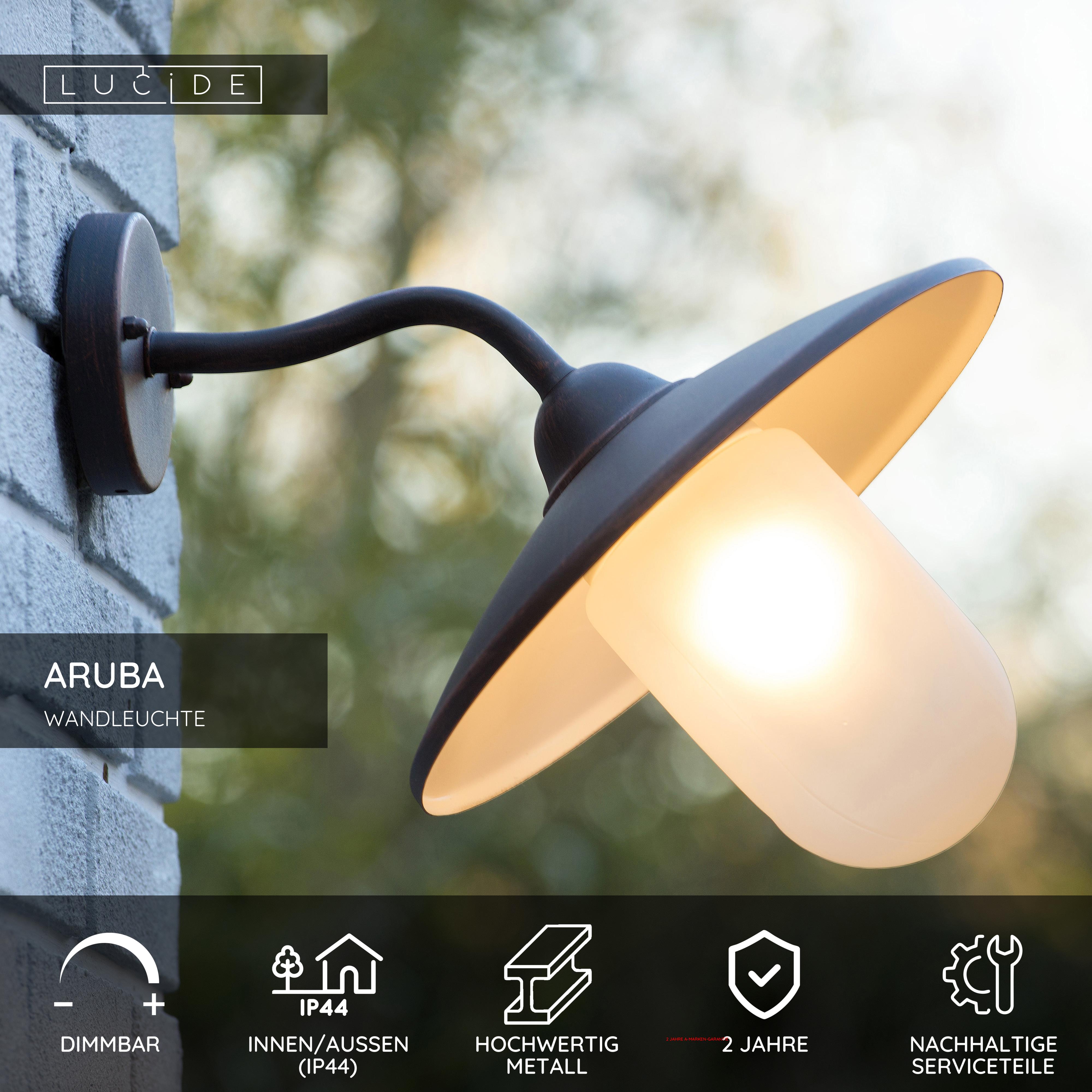 Genießen Sie dem Sommer, genießen Sie Ihrem Garten und Ihrer Terrasse. Mit Aruba fangen Sie schon mal gut an. Diese robuste Außenlampe kann nicht nur einfach mit einem Dimmer kombiniert werden - damit Sie immer die richtige Atmosphäre auf der Terrasse erzeugen - sondern hat auch eine authentische Ausstrahlung. Die Kombination aus einer rostbraunen Außenarmatur und dem Mattglas, das die Lichtquelle schützt, passt wunderschön zu einem ländlichen Haus oder innerhalb einer Cottage Umgebung.