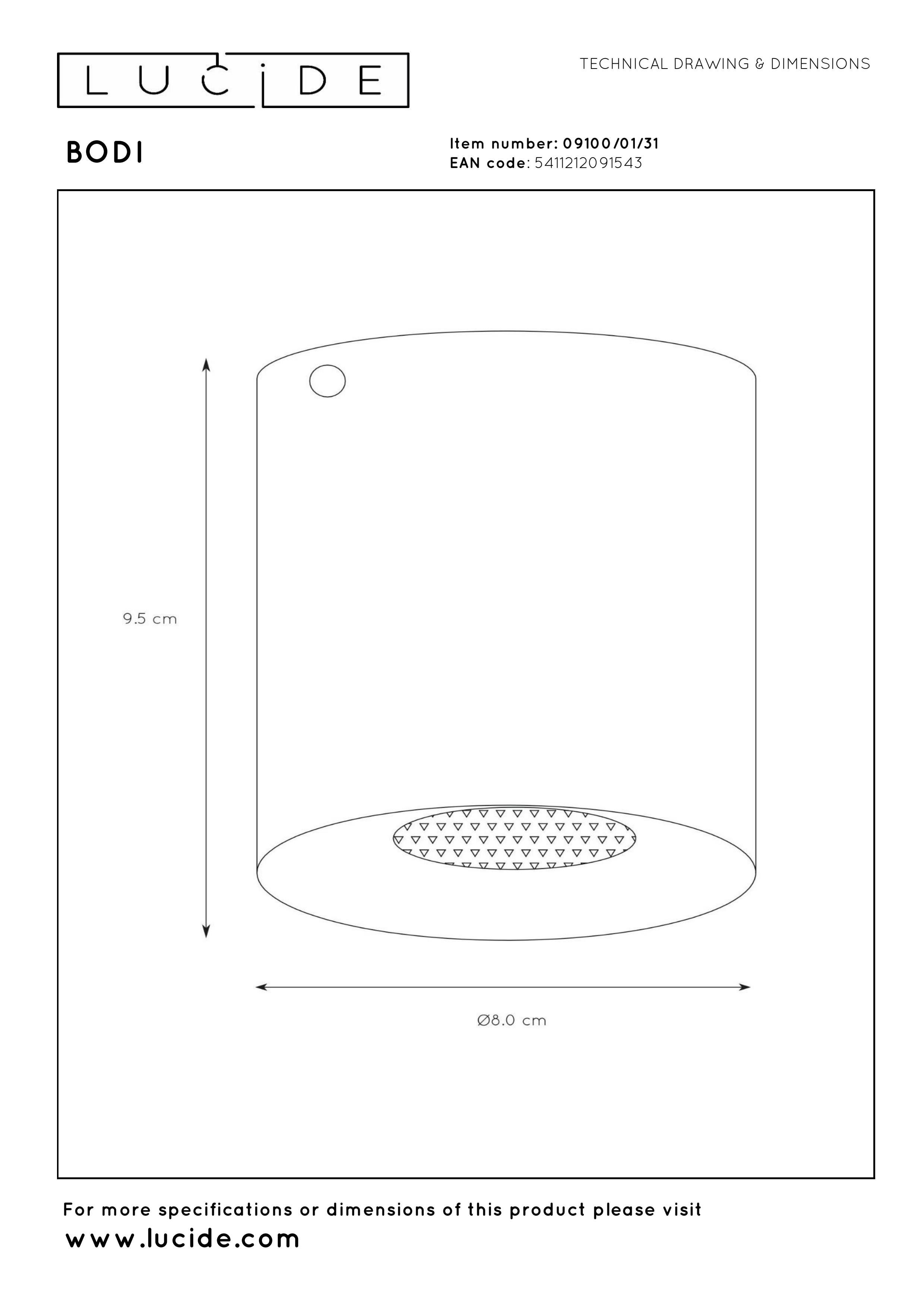 Der Aufbauspot Bodi rund von Lucide ist eine Aluminiumarmatur und hat somit eine hochwertige Ausstrahlung. Mit einem Durchmesser von 8 cm ist die Lampe einfach über der Unterputz-Abzweigdose zu platzieren. Die Lampe ist auch sehr geeignet als Lichtquelle im kleinen Flur oder in der Toilette. Aufgereiht ist die Bodi auch über dem Bar oder der Anrichte zu verwenden. Die Bodi is mit einer GU10 Hochvoltfassung versehen und wird ohne Lichtquelle geliefert. Sie haben die Wahl aus einem (nicht) abblendbaren GU10 LED-Spot oder einem traditionellen abblendbaren GU10 Halogenspot. Die Bodi ist in Aluminiumfarbe, weißer und schwarzer Farbe erhältlich.