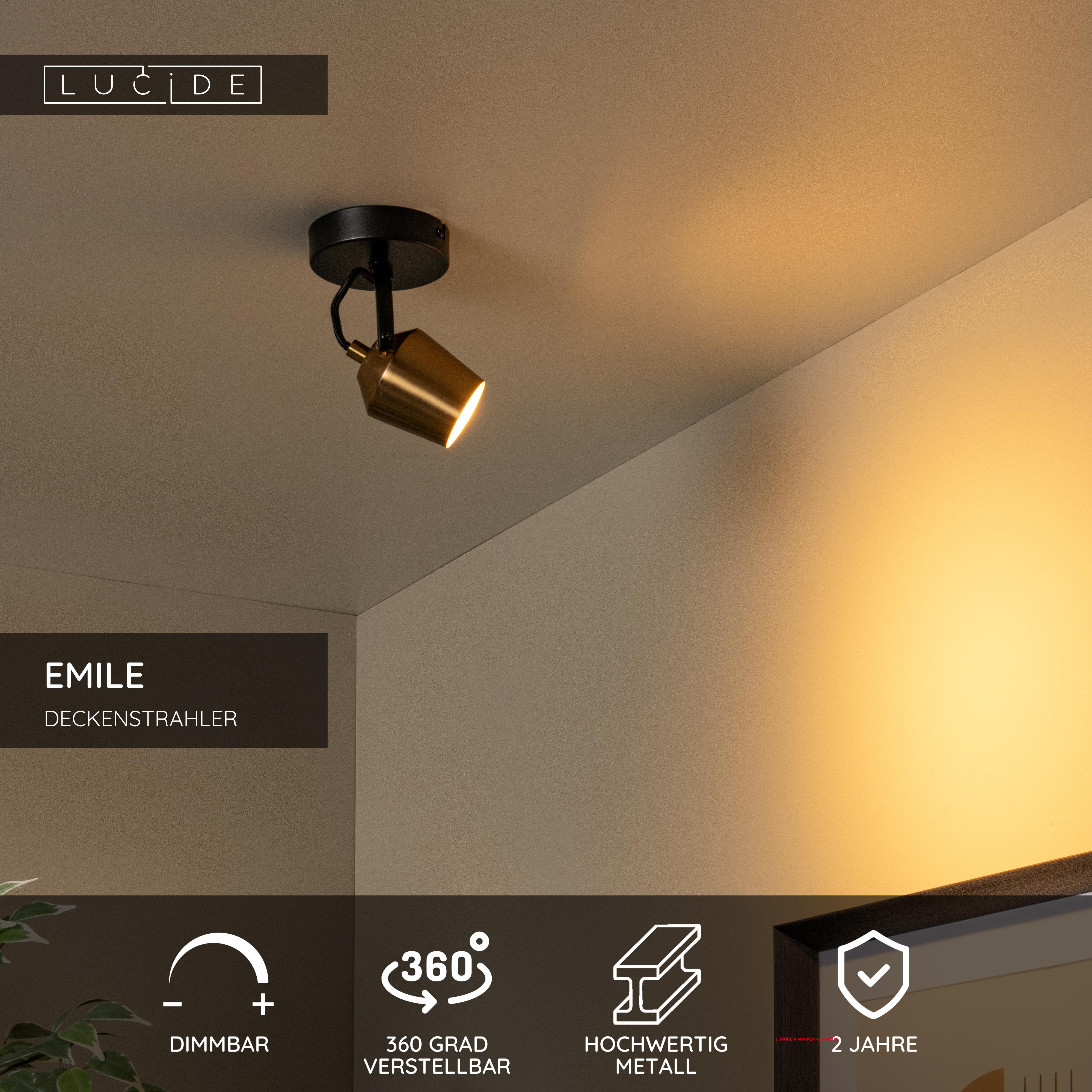 Beleuchten Sie Ihr Zuhause mit dem stilvollen Lucide EMILE Deckenstrahler. Dank des dreh- und schwenkbaren Lampenkopfs können Sie das Licht genau dorthin lenken, wo Sie es benötigen – ideal, um eine gemütliche Atmosphäre zu schaffen oder bestimmte Bereiche hervorzuheben. Gefertigt aus hochwertigem Metall mit einer matten Gold-/Messing-Oberfläche, bietet diese Deckenleuchte sowohl energieeffiziente Beleuchtung als auch ein modernes Design. Geeignet für eine LED-Lichtquelle (GU10) und einfach über einen Wandschalter (nicht enthalten) zu bedienen. Mit einer Höhe von 17,5 cm und einer kompakten Deckenplatte (Ø 10,5 cm) setzt der EMILE einen zeitlos stilvollen Akzent in jeden Raum. Bestellen Sie noch heute und erleben Sie die Vielseitigkeit dieses eleganten Deckenstrahlers!