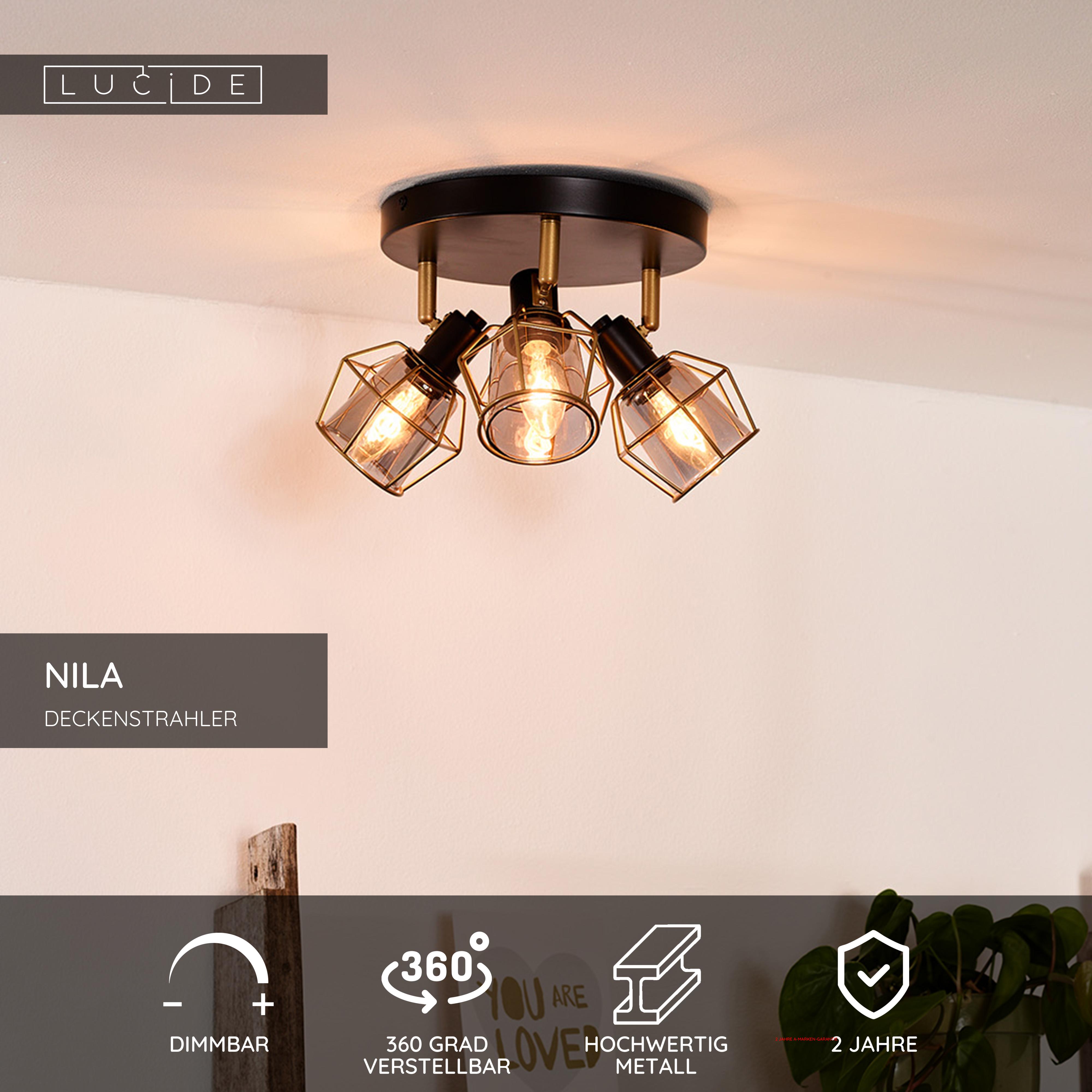 Drei Lichtpunkte auf einem runden Sockel, der an der Decke montiert ist. Dieser Deckenstrahler namens Nila ist funktionell und wirklich außergewöhnlich. Sie können die drei Lampen kippen und drehen, so dass selbst die dunkelste Ecke des Hauses taghell beleuchtet wird. Der Glas-Lampenschirm ist in einem Metall-Messingkäfig gut geschützt. Das Messing bildet einen faszinierenden Kontrast zum schwarzen Design und hebt Nila hervor. Mit einem Durchmesser von 36 Zentimetern können Sie sie auch einfach an der Decke befestigen. Verbinden Sie Nila mit einem Dimmer und schaffen Sie die ultimative Atmosphäre in Ihrem Zuhause.