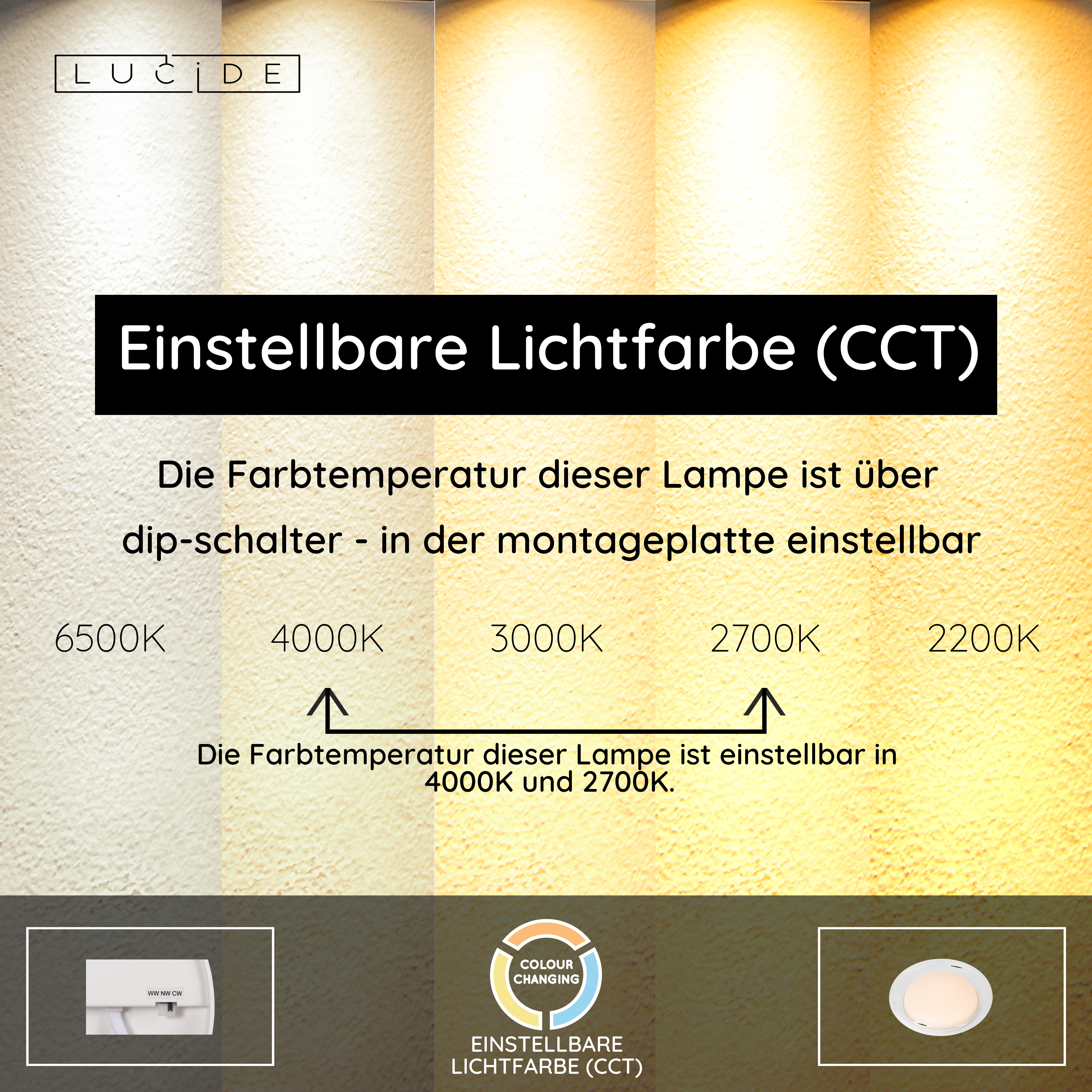 - Farbtemperatur einstellbar über DIP-Schalter in der Montageplatte (2700K-4000K)