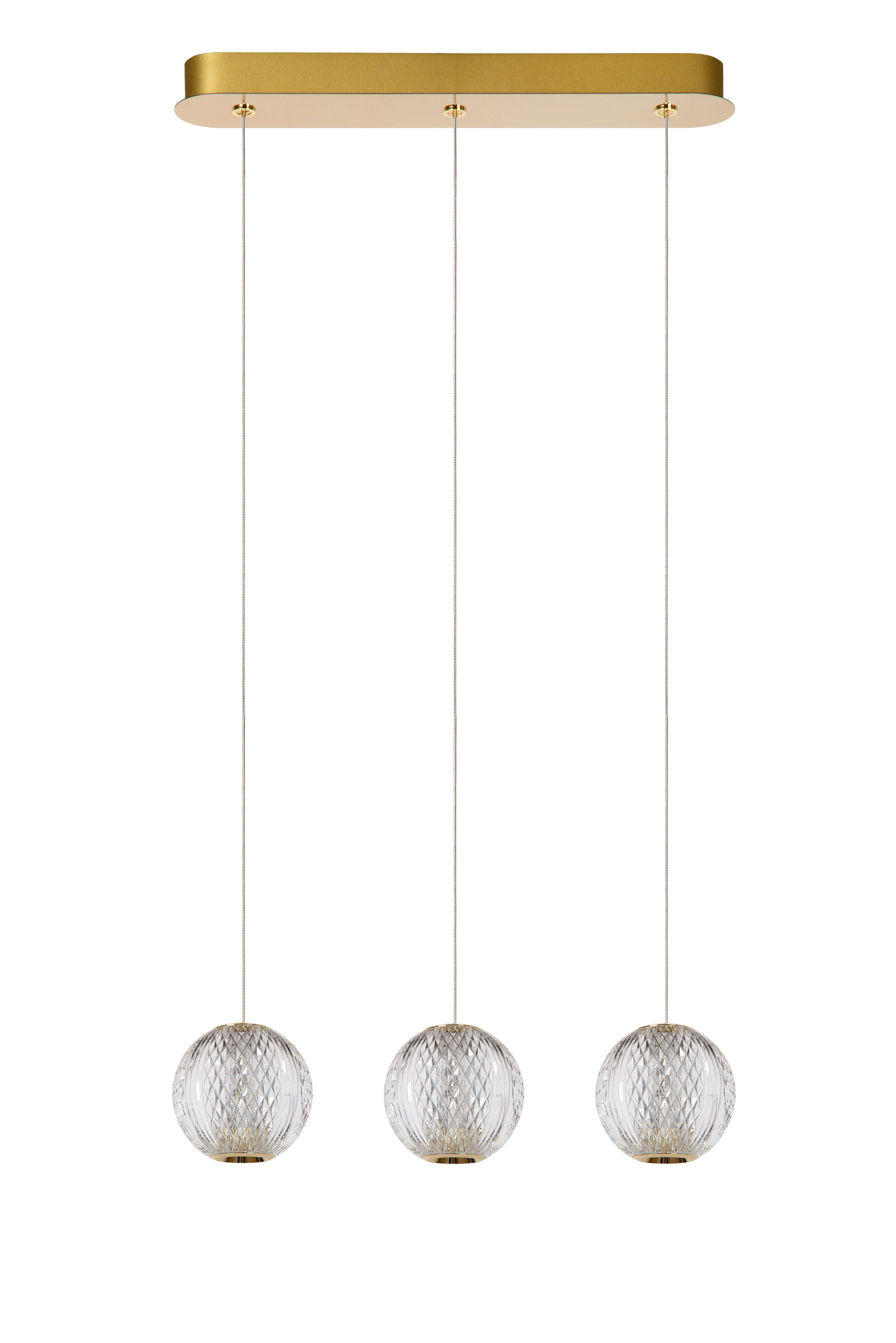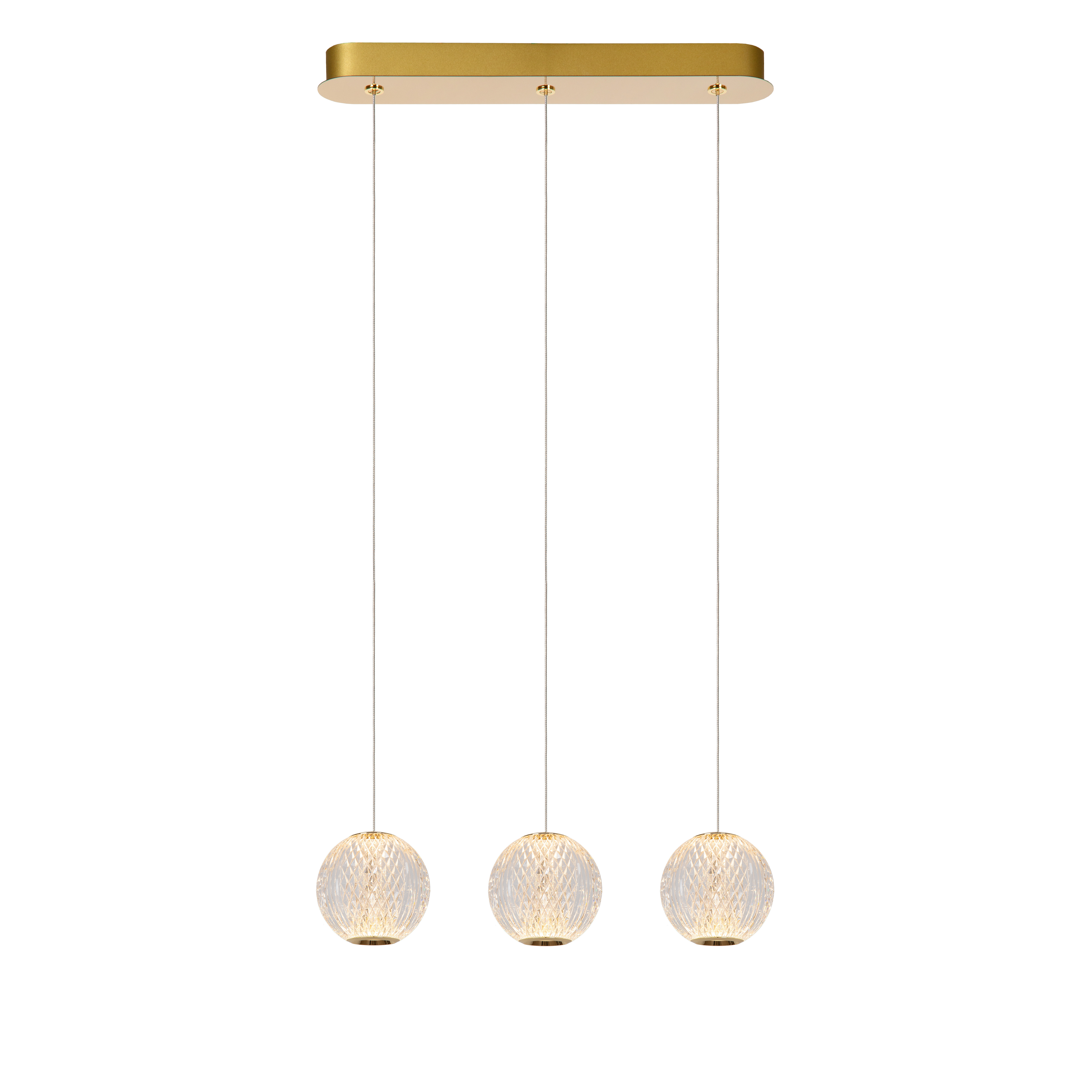 Die 3 Birnen von Cintra hängen in einer geraden Linie und sorgen für einen eleganten Look mit viel Charakter. Das hochwertige Acryl mit tiefen Rillen verleiht den Lampenschirmen das Aussehen von Kristall. Die integrierten dimmbaren LED-Lampen verbreiten warmweißes Licht im ganzen Raum: über dem Esstisch, im Schlafzimmer oder in der Sitzecke. Die Pendelleuchte hat einen Durchmesser von 25 Zentimetern und ist zwischen 50 und 150 Zentimetern höhenverstellbar. Die edle Pendelleuchte ist mit Messingdetails versehen und verleiht Ihrer Einrichtung einen besonderen Hauch von Gemütlichkeit.