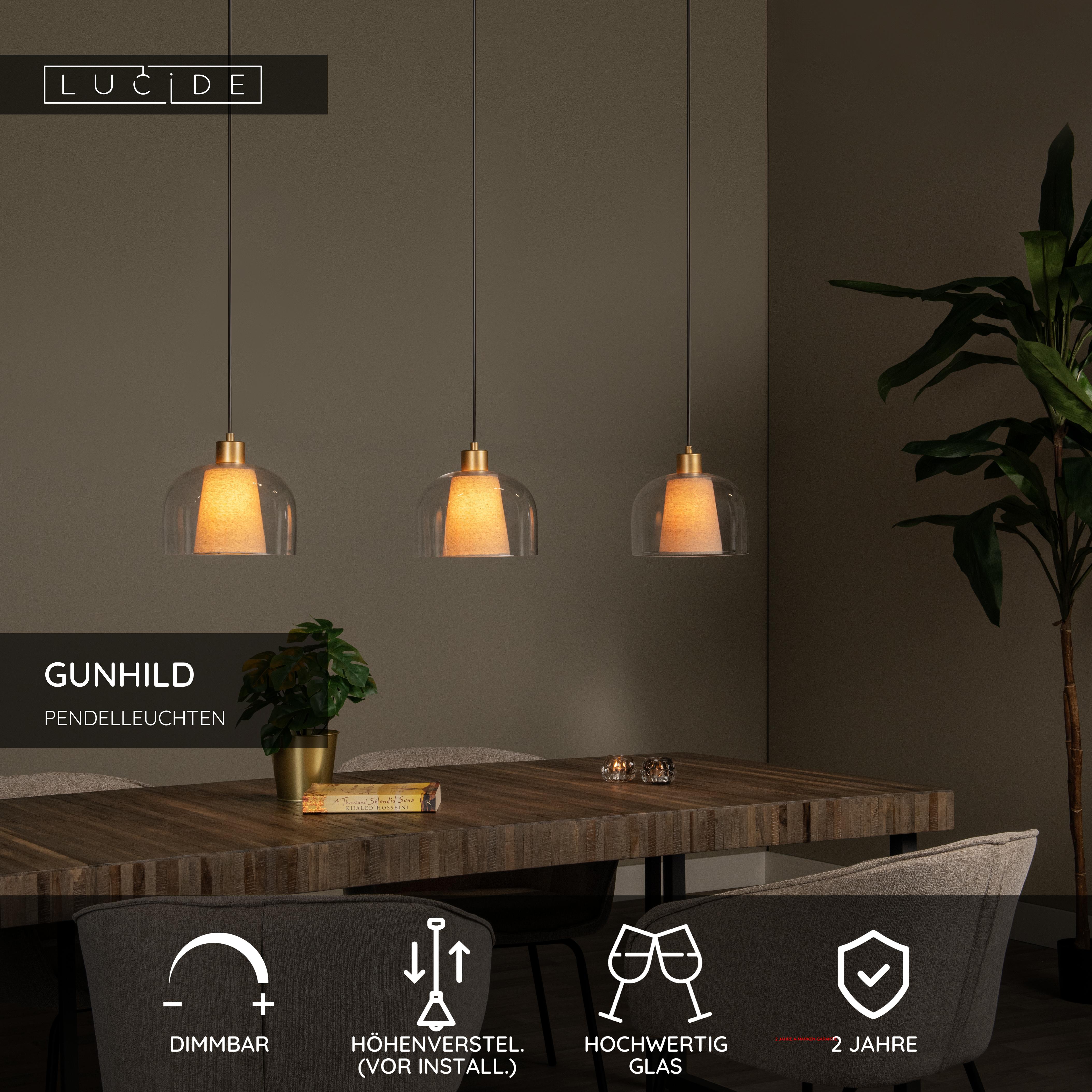 Unter dem kompakten Lampenschirm aus Glas verbergen sich kostbare Lampenschirme aus Leinen. Was hat Gunhild zu erzählen? Diese stilvolle Pendelleuchte regt die Neugierde und Kreativität an. Die elegante Pendelleuchte, die aus drei Lichtquellen in einer Reihe besteht, eignet sich perfekt als Stimmungslicht über dem Esstisch oder der Anrichte. Sie bringt Sie immer in die richtige Stimmung. Erst recht, wenn Sie die Lampe an einen geeigneten Dimmer anschließen, schaffen Sie überall das ideale Licht. Die Lampen sind zudem leicht in der Höhe verstellbar und fügt sich so mühelos in jeden Raum ein. Lassen Sie sich von der zeitlosen Klasse von Gunhild verführen.