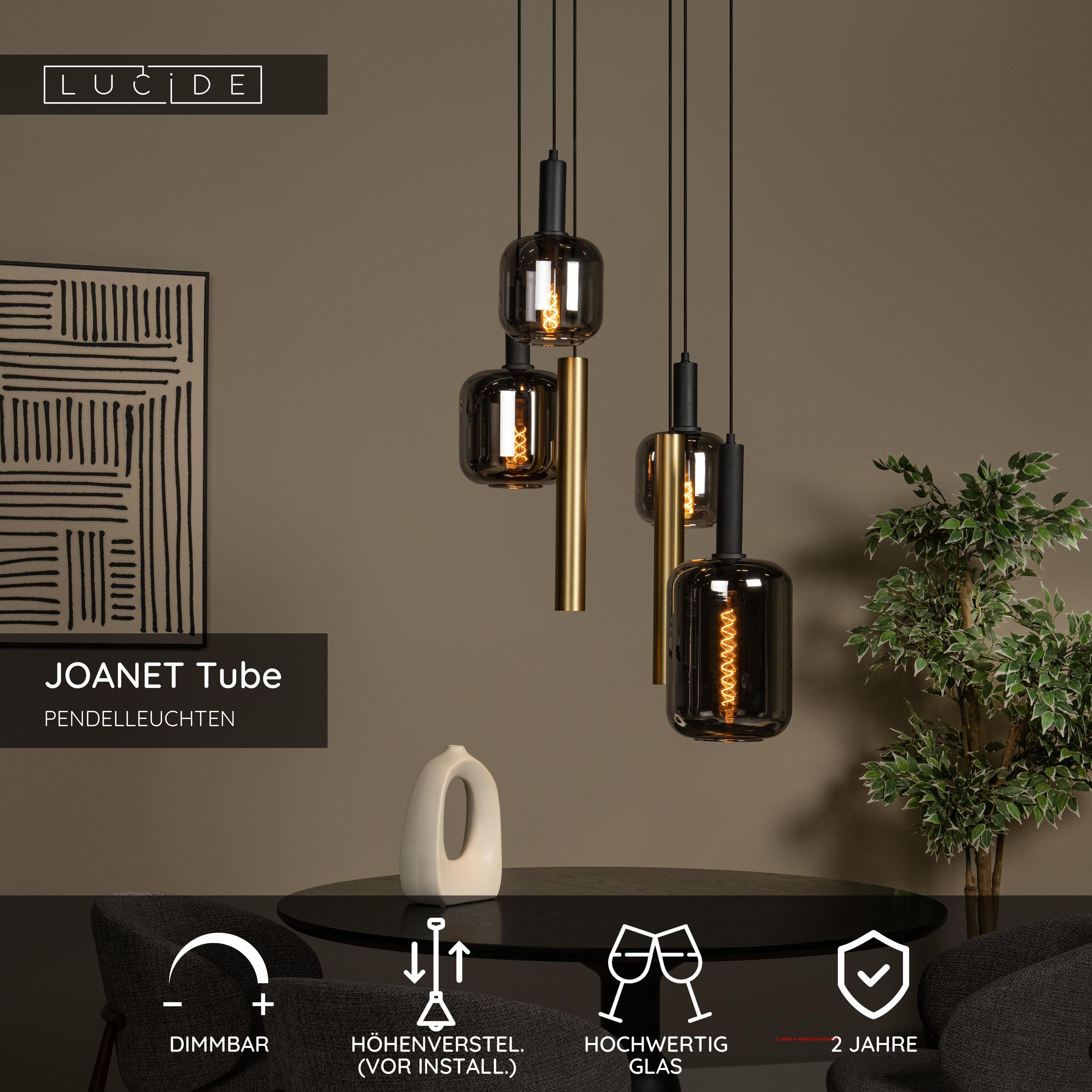 Mehr ist besser. Das gilt zumindest für diese Pendelleuchte namens Joanet. Nicht ein oder zwei, sondern bis zu sechs Lichtpunkte baumeln stilvoll von der Montageplatte herunter. Umgeben von einem eleganten Glasgehäuse mit einer Kombination aus Klar- und Rauchglas. Die unterschiedlichen Größen des Glases verleihen der Leuchte eine gewisse Dynamik. Um die Magie maximal zu genießen, wählen Sie Glühfadenlampen. Schließen Sie Joanet an einen Dimmer an, um sofort einen echten Stimmungsmacher in Ihr Interieur zu integrieren.