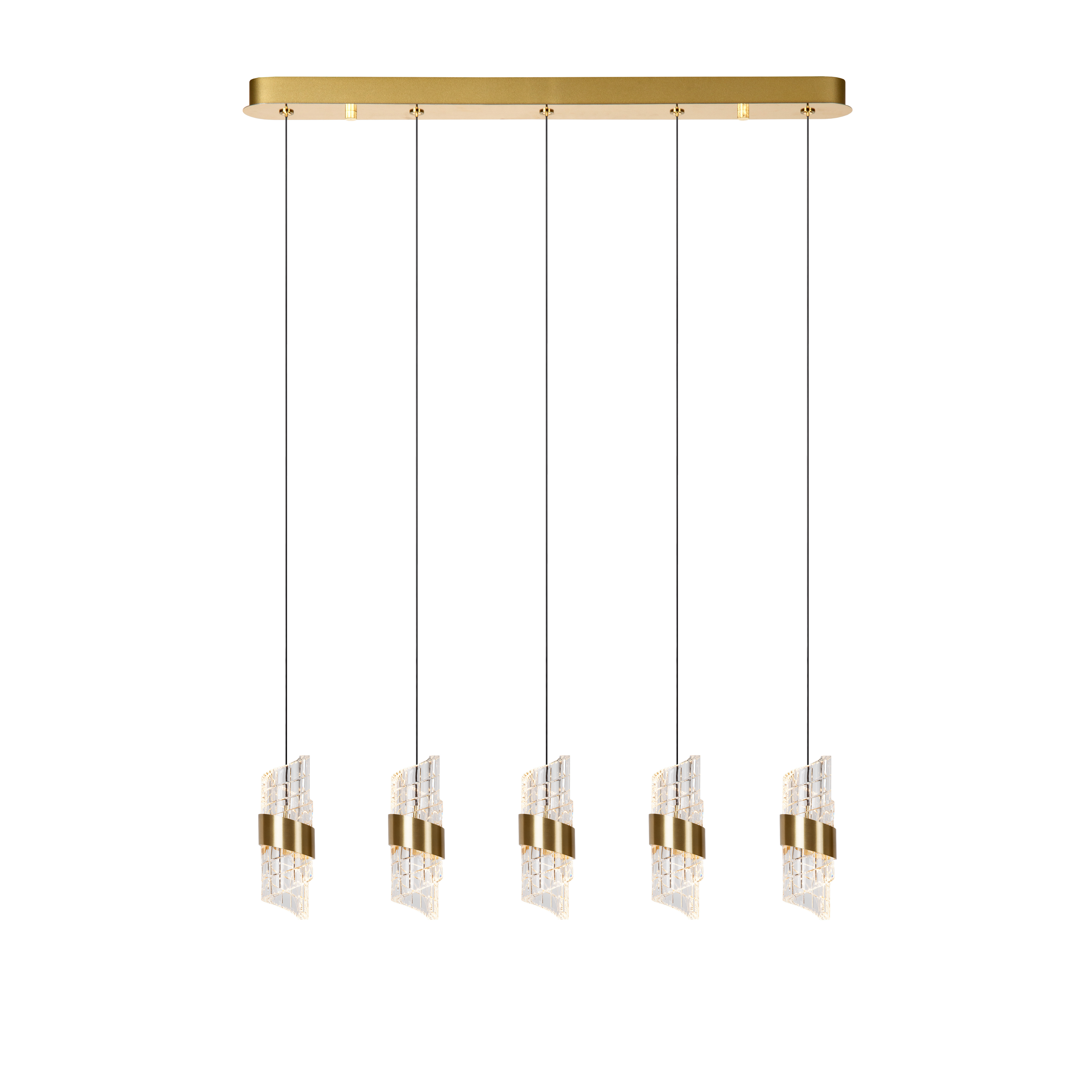 Bringen Sie Ihre Innenräume mit Kligande in nie dagewesene Höhen: die ultimative Kombination aus Eleganz und Funktionalität. Diese vielseitige, rechteckige Leuchte mit 5 Pendeln ist für jeden Raum im Haus geeignet. Schließen Sie die Pendellampe einfach an einen Dimmer an, um ein perfektes Ambiente für jede Gelegenheit zu schaffen. Jede integrierte LED-Lichtquelle ist von einem Lampenschirm aus hochwertigem Acryl mit Metallband umgeben. Das zeitlose Design passt sich mühelos an jeden Einrichtungsstil an: modern, klassisch oder industriell. Verschönern Sie Ihr Interieur mit diesem Hingucker.