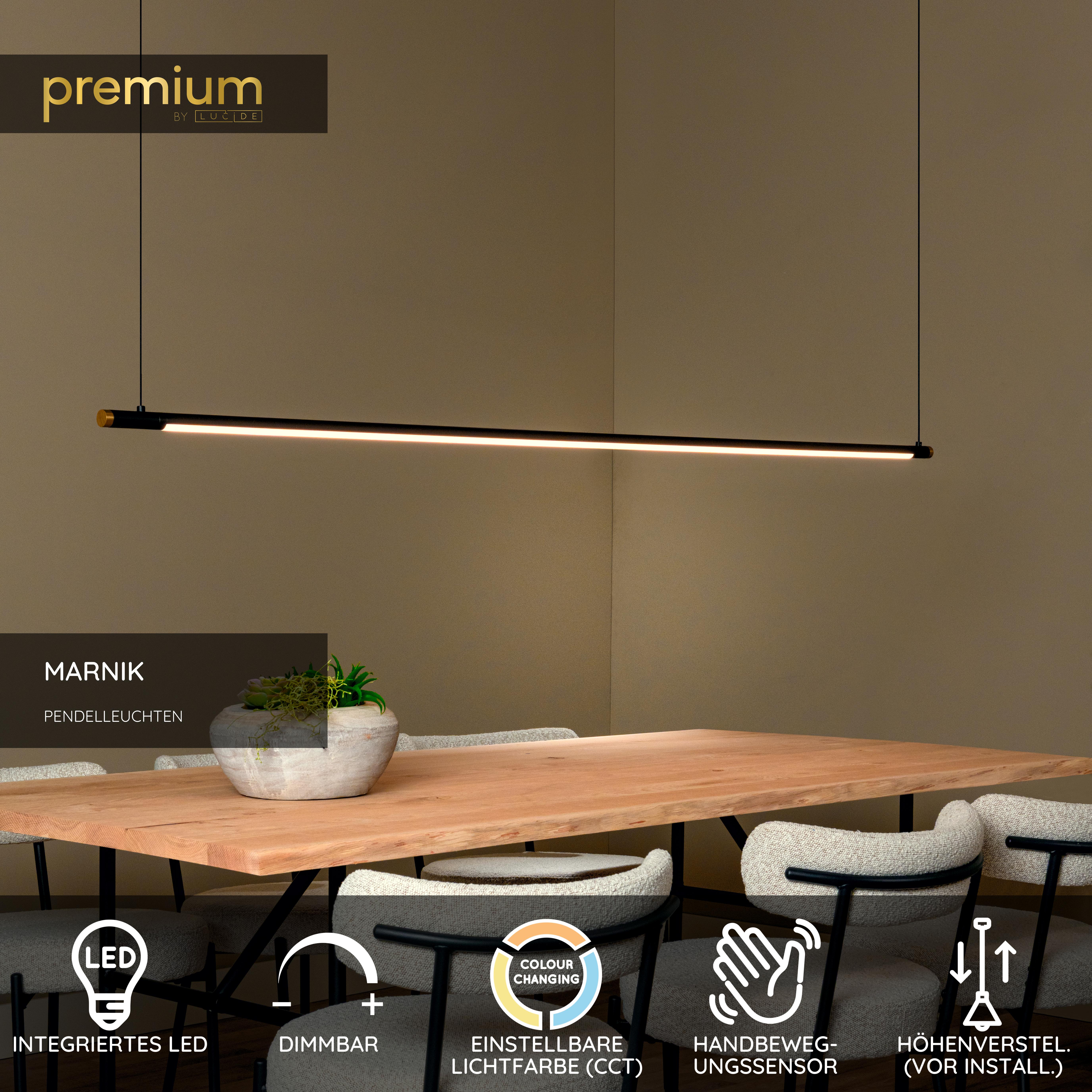 Bringen Sie raffinierte Luxus in Ihr Interieur mit der Lucide Premium MARNIK Pendelleuchte. Diese moderne Pendelleuchte kombiniert ein schlankes Design mit intelligenter Technologie und ist sowohl funktional als auch elegant. Die integrierte 24W-LED-Lichtquelle bietet dimmbares warmweißes Licht (2700K-4000K), das einfach über den praktischen Handbewegungssensor gesteuert werden kann. Dank des höhenverstellbaren Kabels können Sie die MARNIK mühelos an Ihren Raum anpassen. Mit einem Durchmesser von 2,5 cm und einer maximalen Höhe von 160 cm ist diese zylindrische Lampe ideal über einem Esstisch oder als stilvolle Akzentbeleuchtung. Hergestellt aus hochwertigem Aluminium und mit einer mattschwarzen Oberfläche sowie einem goldenen Detail versehen, fügt sich die Pendelleuchte perfekt in moderne Interieurs ein. Entdecken Sie die Kraft von Design und Funktionalität und verleihen Sie Ihrem Interieur ein luxuriöses Upgrade mit der Lucide Premium MARNIK. Dieses Produkt darf nicht an einen Wandschalter angeschlossen werden und kann nur über die Bedienelemente am Produkt selbst gesteuert werden.