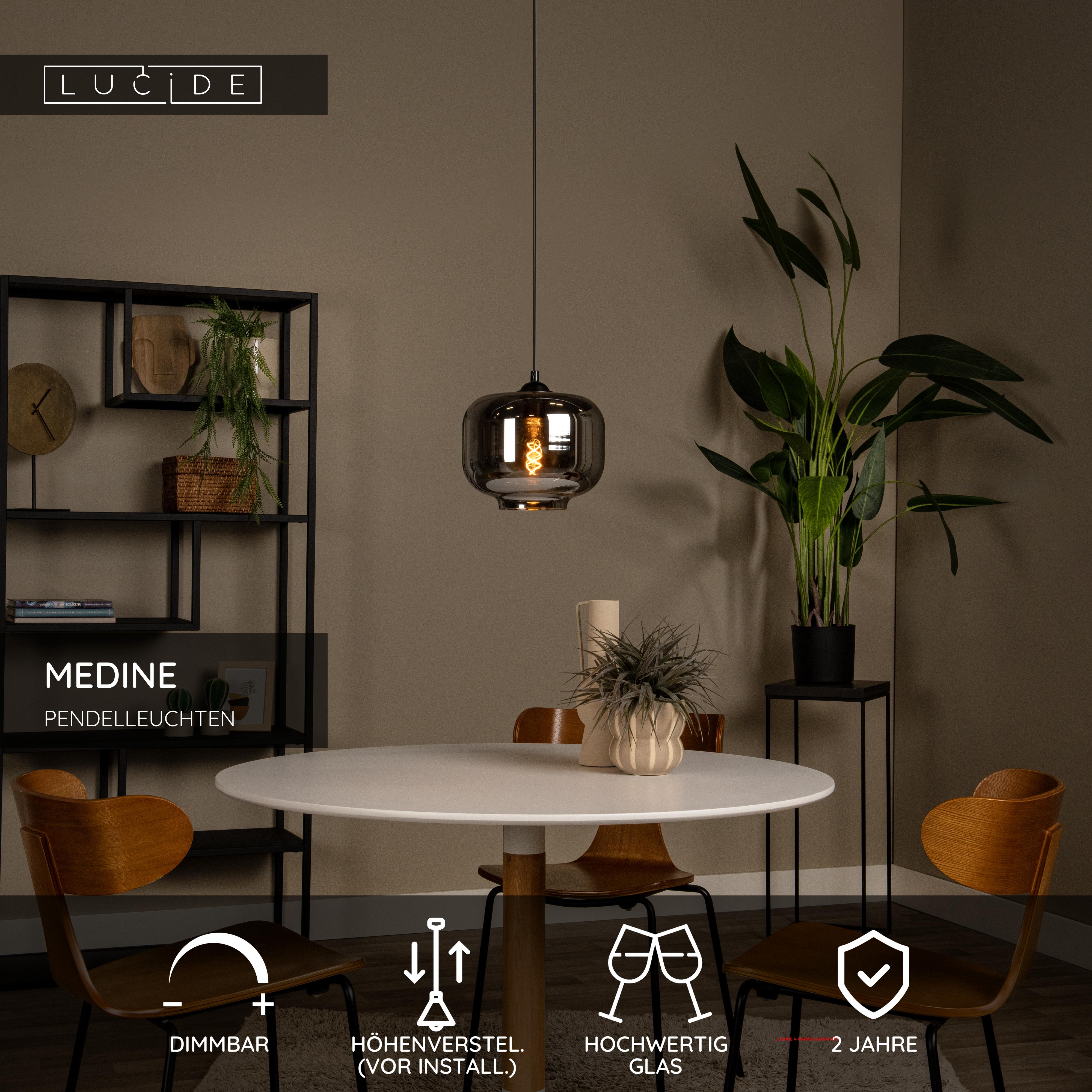 Mit der Hängeleuchte Medine erhalten Sie einen modernen Blickfang für Ihr Zuhause. Der Lichtpunkt ist von einer Glaskuppel aus Rauchglas umgeben. Das macht Medine besonders geschmackvoll. Dank der Reflexionen des Glases erhält die Lampe selbst die volle Aufmerksamkeit. Deshalb sollten Sie für eine optimale Wirkung vorzugsweise eine Filamentleuchte wählen. Bei der Installation stellen Sie das Pendant einfach auf die gewünschte Höhe (von 50 bis 156 Zentimeter) und verbinden es einfach mit einem Dimmer. Die Montage erfolgt in 1, 2, 3 durch Verschrauben der Montageplatte mit der Decke.