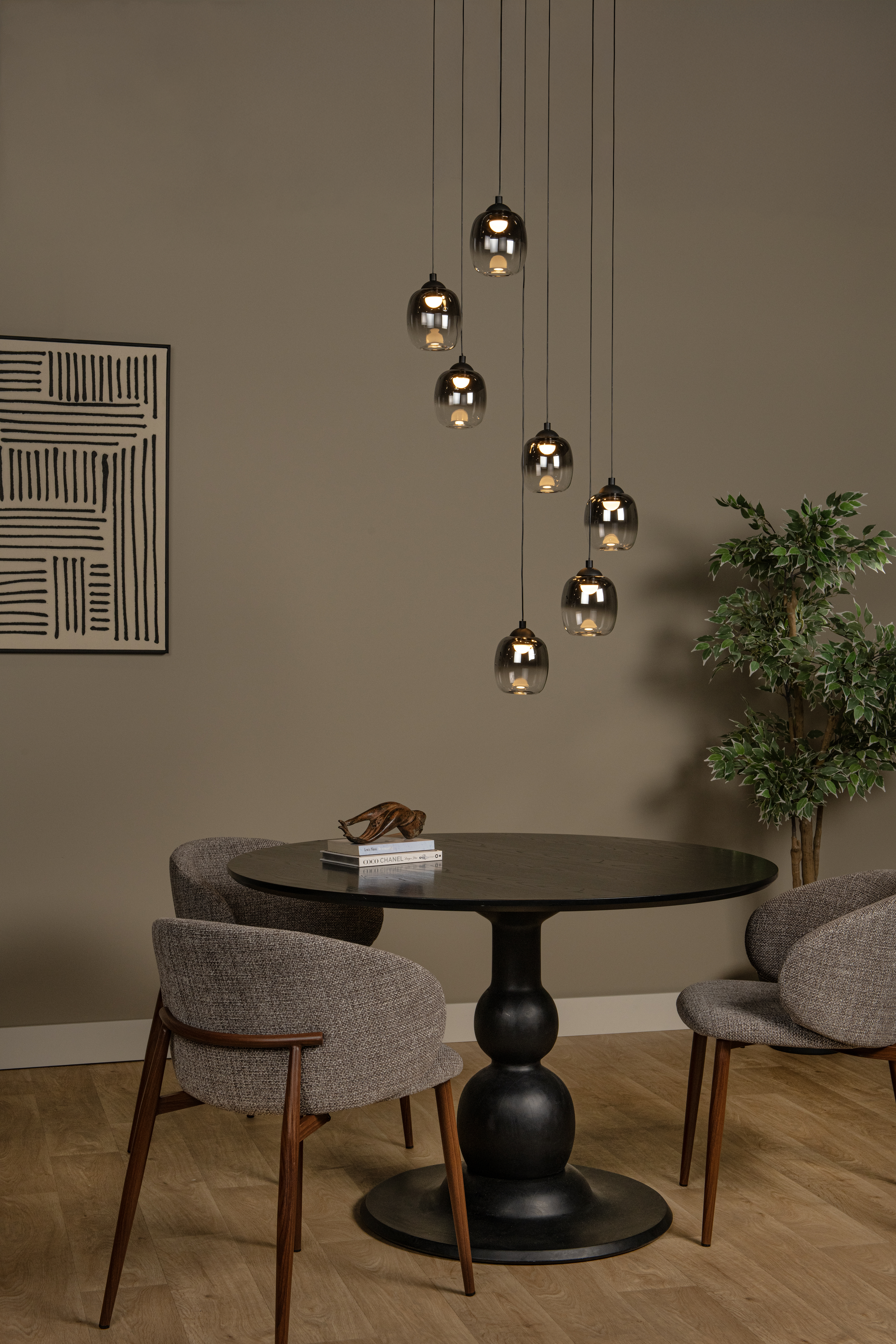 Wer Tamino sagt, der sagt Ruhe und Gemütlichkeit. Die 5 Pendelleuchten setzen sich aus hochwertigen, rauchfarbenen Glaslampenschirmen mit eingebauter Linse zusammen. So entsteht ein besonderer Lichteffekt, der das Licht im Glas reflektiert. Tamino verbreitet so ein gedämpftes, weiches Licht, vor allem, wenn sie an einen Dimmer angeschlossen ist. Wenn Sie die Länge der Pendelleuchten bei der Montage variieren, können Sie Tamino einen subtilen spielerischen Touch verleihen. Ideal als Blickfang in Ihrem Innenraum.