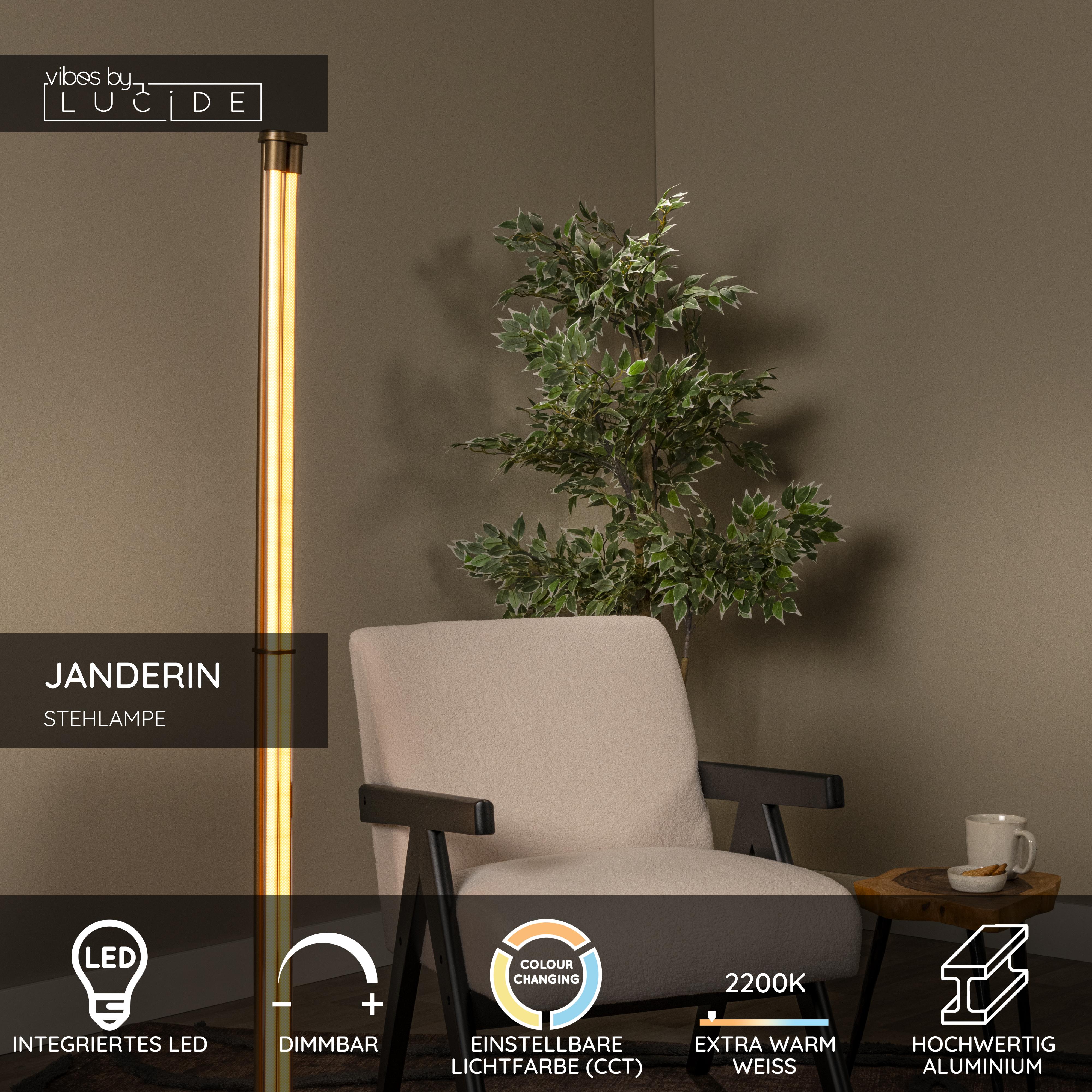 Die Lucide JANDERIN Stehleuchte vereint Raffinesse und Innovation in einem stilvollen Design. Diese champagnerfarbene Stehlampe verfügt über zwei integrierte LED-Lichtquellen (2x17W), die sowohl dimmbar als auch in der Farbtemperatur von 2700K bis 4000K einstellbar sind. Dank des Handbewegungssensors lässt sich das Licht mit einer einfachen Geste ein- oder ausschalten. Mit einer Höhe von 155,9 cm, einer Breite von 24 cm und einer Tiefe von 20,2 cm ist diese moderne Stehleuchte ein eleganter Blickfang in jedem Wohn- oder Arbeitsbereich. Wähle Benutzerkomfort und zeitloses Design mit JANDERIN.