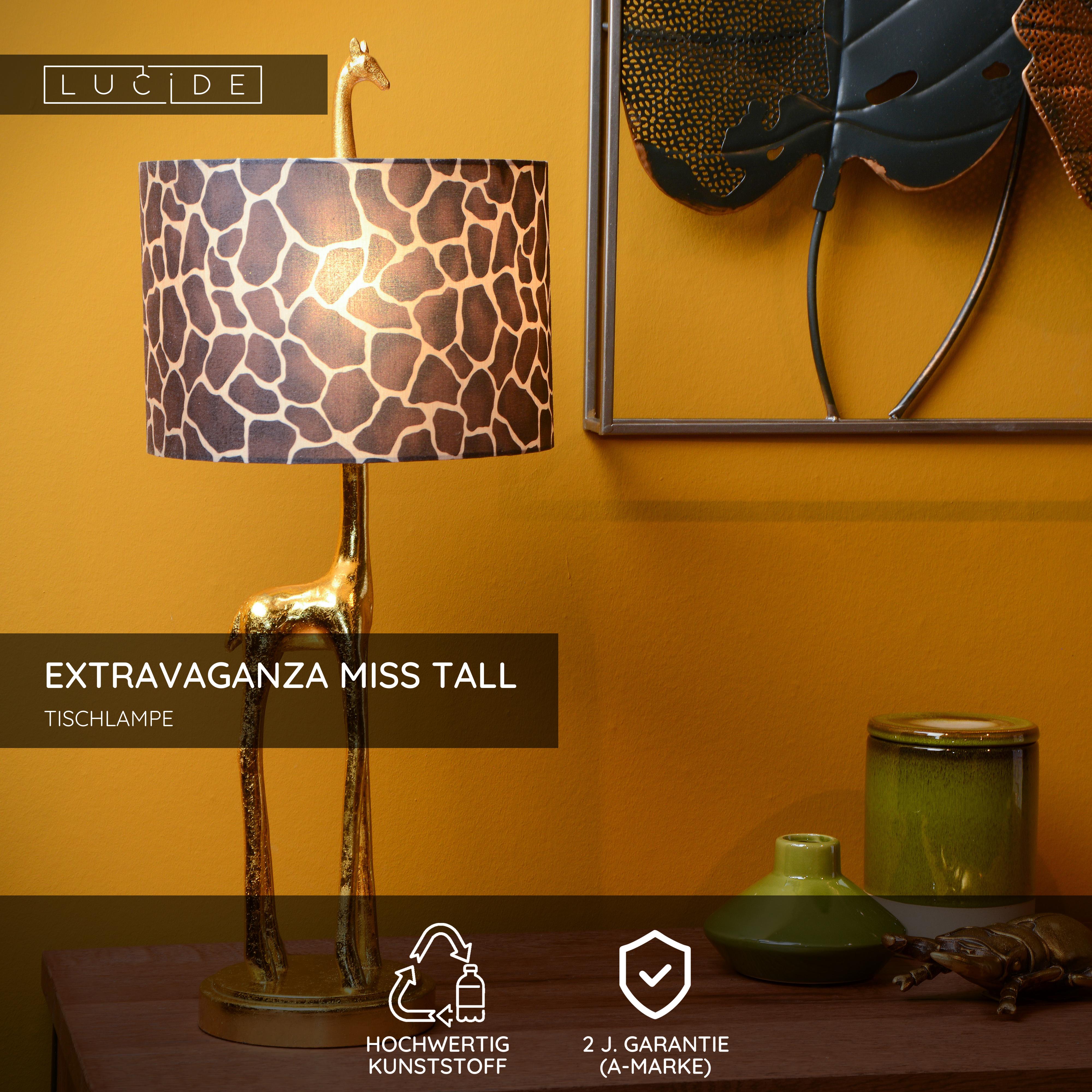 Lernen Sie das neueste Produkt unserer Extravaganza-Serie kennen. Miss Tall bietet eine originelle Perspektive auf die Beleuchtung und auf Giraffen. Willkommen im Dschungel! Diese Tischlampe ist vom Sockel bis in die Höhe 60,5 cm hoch und hat einen Lampenschirm mit einem Durchmesser von 25 cm. Die LED-Lichtquelle befindet sich in der Mitte des Lampenschirms. Miss Tall ist verspielt und zieht mit ihrem einzigartigen Design die Blicke auf sich. Sie bedienen Miss Tall ganz einfach über den Schalter am Kabel.