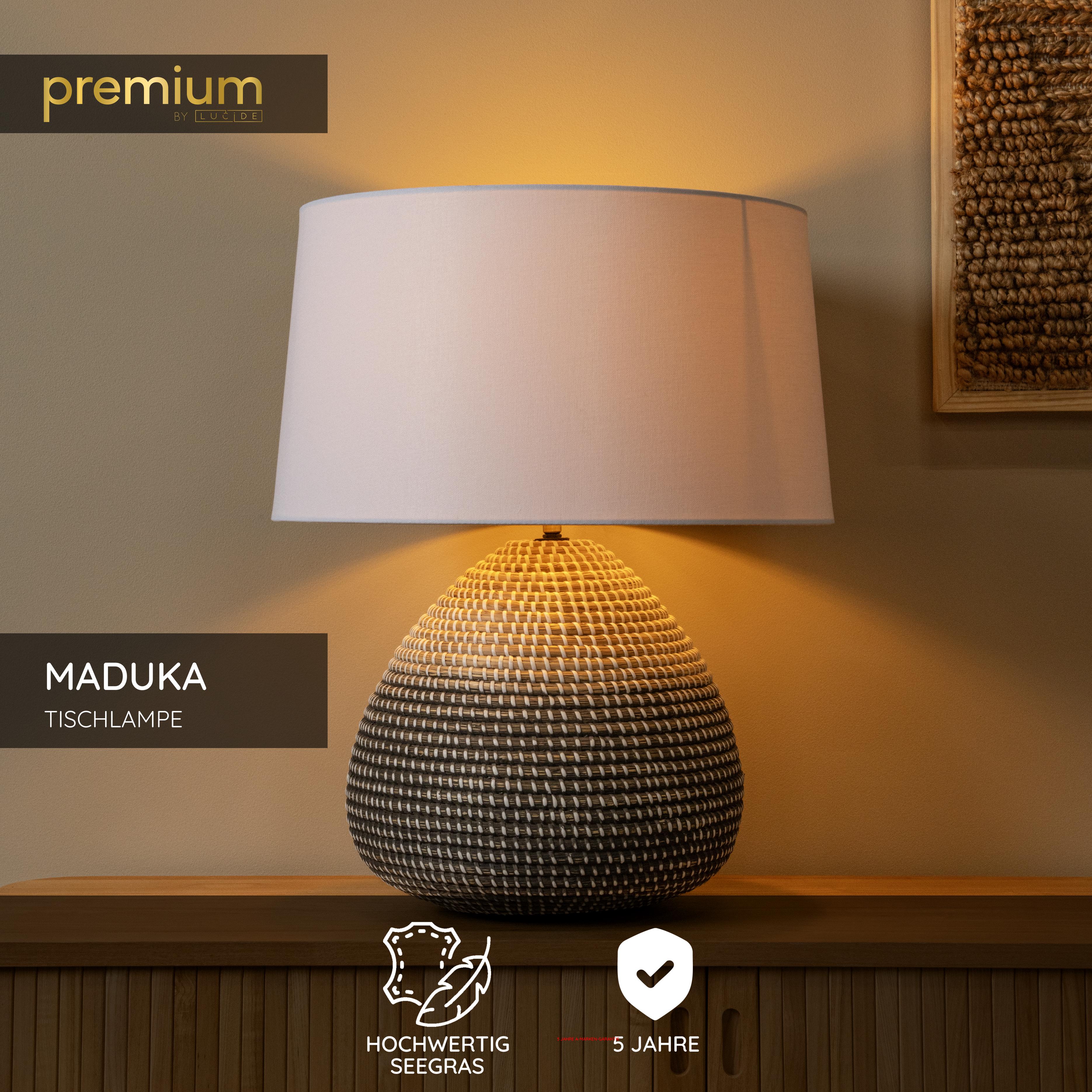Wenn Sie weiche und natürliche Materialien lieben und voll und ganz auf nachhaltige Produkte setzen, dann ist Maduka genau die Lampe, die Sie suchen. Diese Tischlampe hat einen runden Schirm aus Leinen und einen konischen Sockel aus hochwertigem Seegras. Mit einer Höhe von 54 Zentimetern hat Maduka einen prominenten Platz in Ihrer Sitzecke verdient. Der praktische Schalter am Kabel ermöglicht es Ihnen, die Stehlampe schnell ein- und auszuschalten. So erfüllt Maduka zu jeder Zeit Ihre Bedürfnisse.