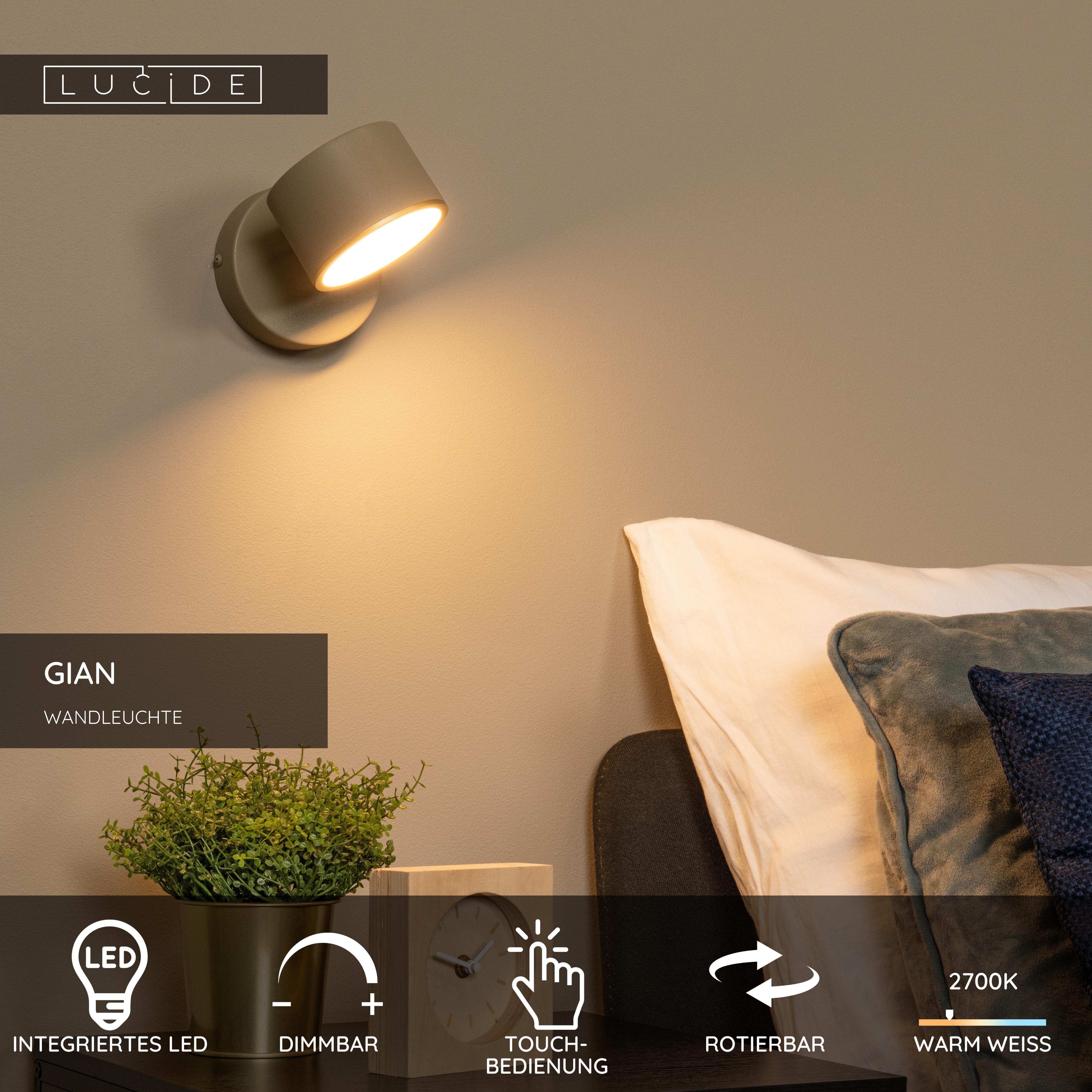 Die Lucide GIAN Wandleuchte strahlt zeitlose Eleganz mit ihrer modernen taupefarbenen Oberfläche und ihrem schlanken Metalldesign aus. Ausgestattet mit einer integrierten dimmbaren LED-Lichtquelle bietet diese Lampe warmweißes Licht von 2700K, ideal für eine gemütliche Atmosphäre. Dank des schwenkbaren Designs lässt sich das Licht einfach ausrichten, um eine optimale Beleuchtung zu gewährleisten. Die kompakten Maße von 17 cm x 11 cm x 13 cm machen diese Wandleuchte vielseitig und für jeden Raum geeignet. Verleihen Sie Ihrem Interieur mit der GIAN Wandleuchte eine stilvolle und funktionale Note!