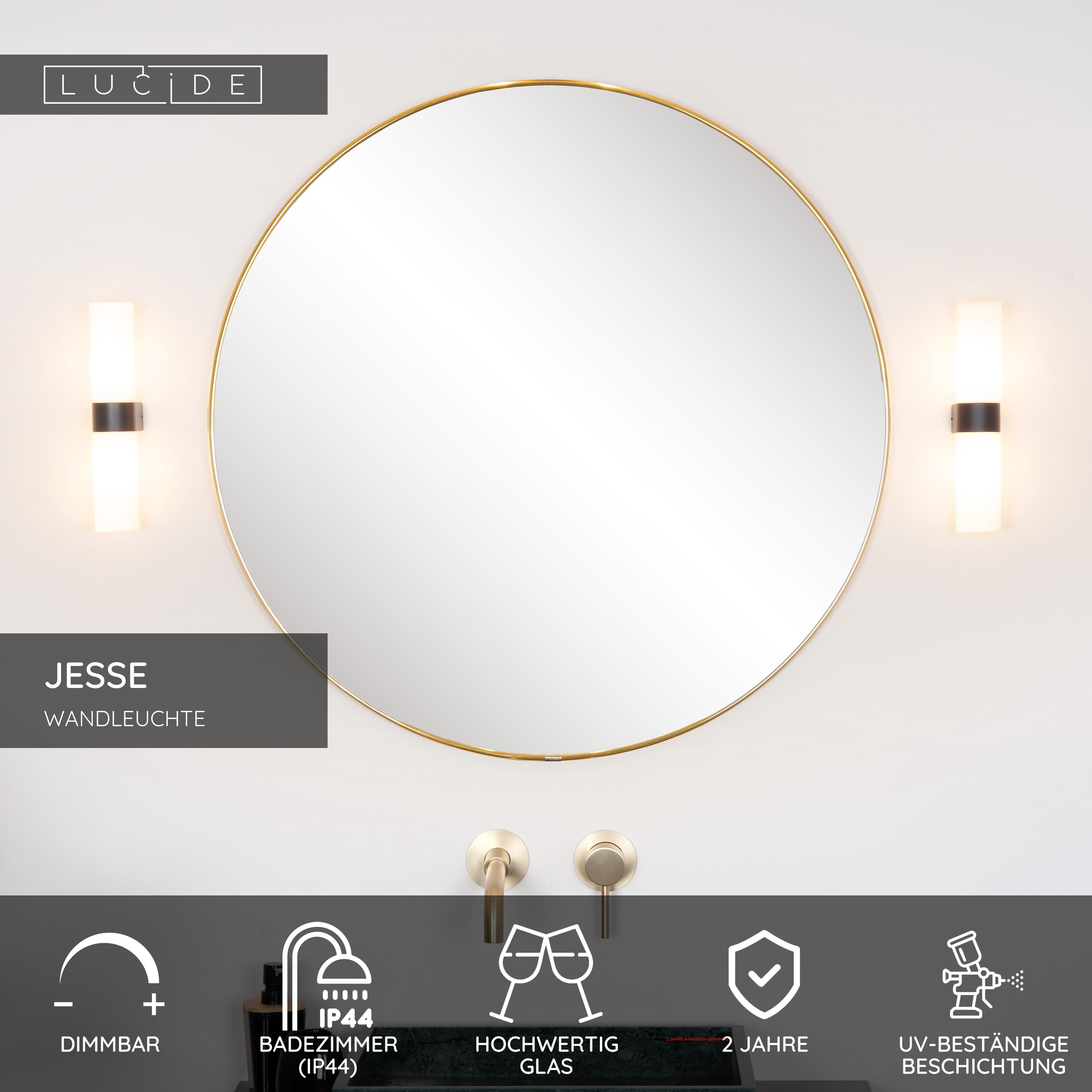 Für diejenigen, die es etwas grösser mögen, gibt es Jesse auch als Wandleuchte mit zwei Lichtpunkten, einem nach oben und einem nach unten gerichtet. Das Licht scheint durch das hochwertige opalfarbene Glas des zylindrischen Schirmes. Zwischen den Lichtquellen befindet sich ein eleganter, schwarzer Metallsockel, mit dem Sie Jesse an der Wand befestigen. Schließen Sie die Wandleuchte an einen kompatiblen Dimmer an, um auch in Ihrem Badezimmer die perfekte Atmosphäre zu schaffen. Das Design ist speziell für den sicheren Einsatz in feuchten Räumen entwickelt.