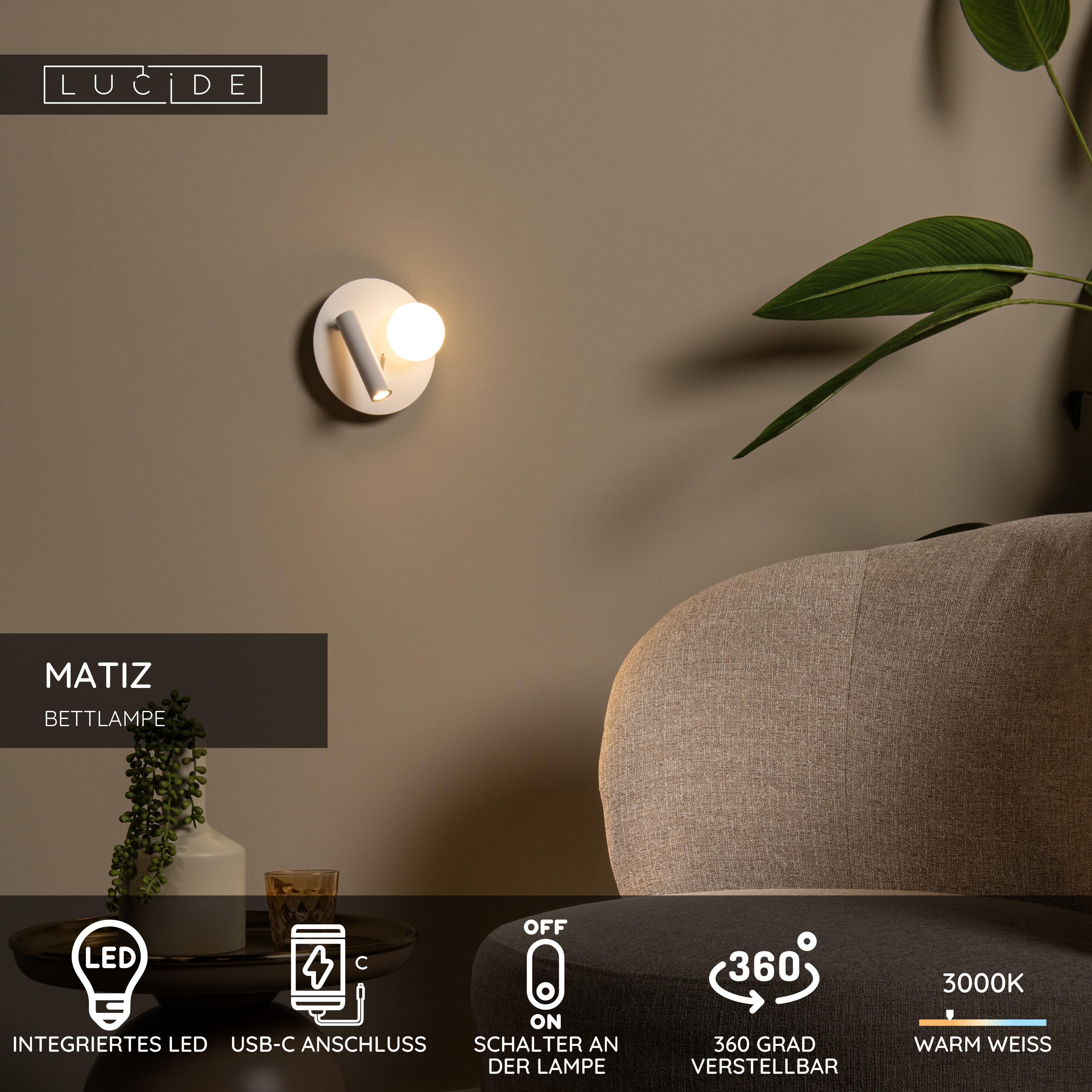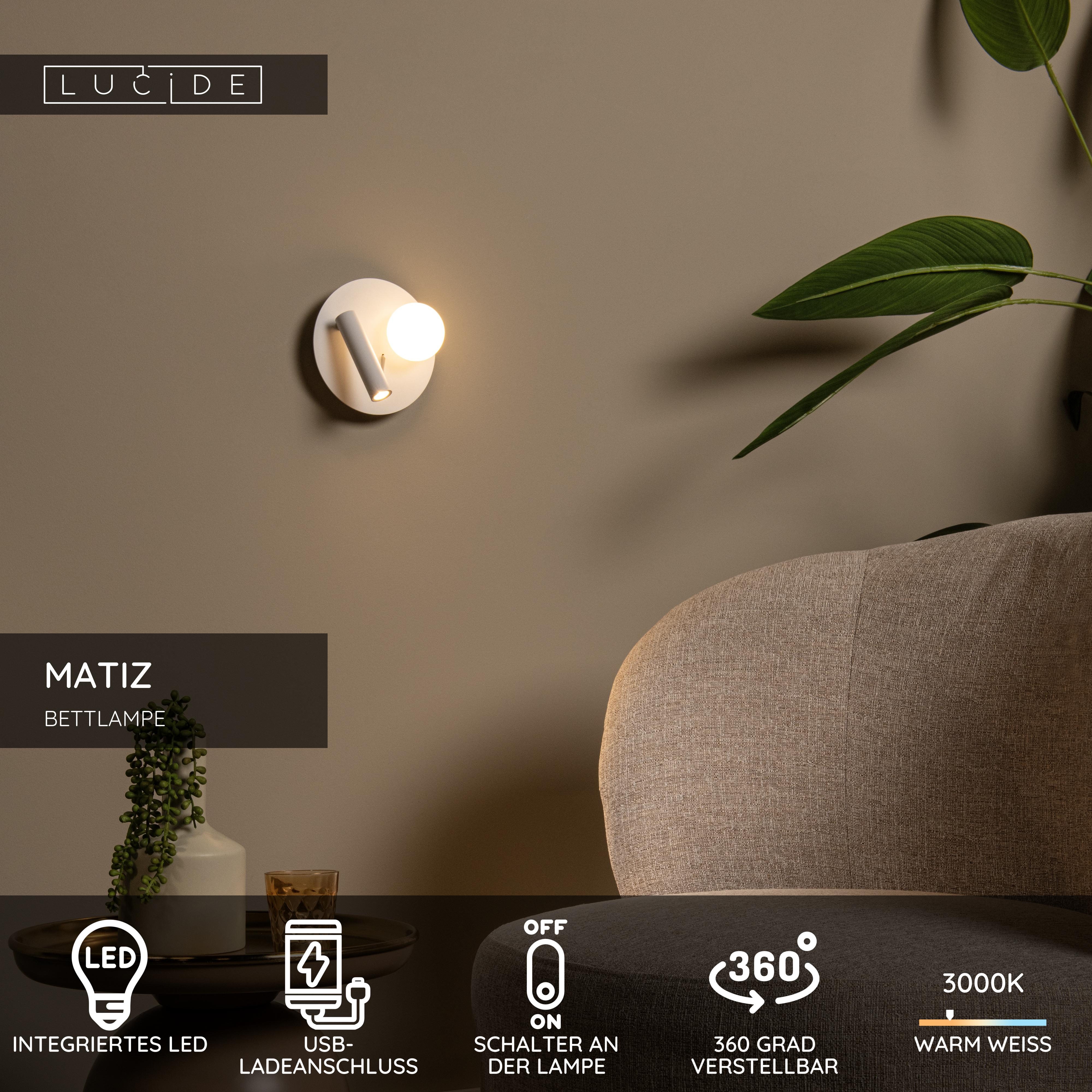 Lucide MATIZ - Bettlampe / Wandleuchte - Ø 16,5 cm - LED - 3000K - Mit USB-Ladepunkt - Weiß