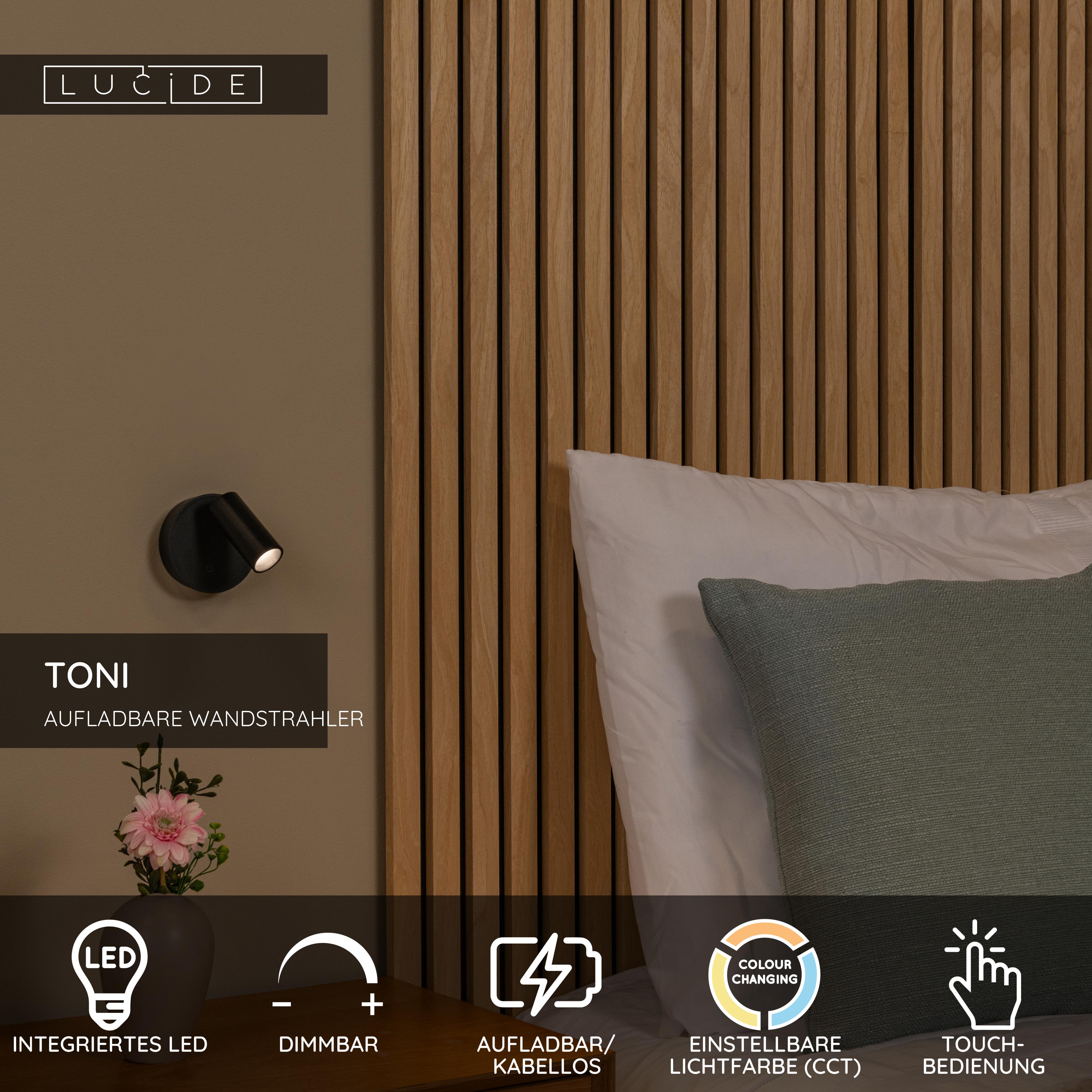 Lucide TONI - wiederaufladbare Wandstrahler / Wandleuchte - Akku/Batterie - Ø 8,1 cm - LED Dim. - CCT - 1x2W 2700K/4000K - Magnetisch - Schwarz