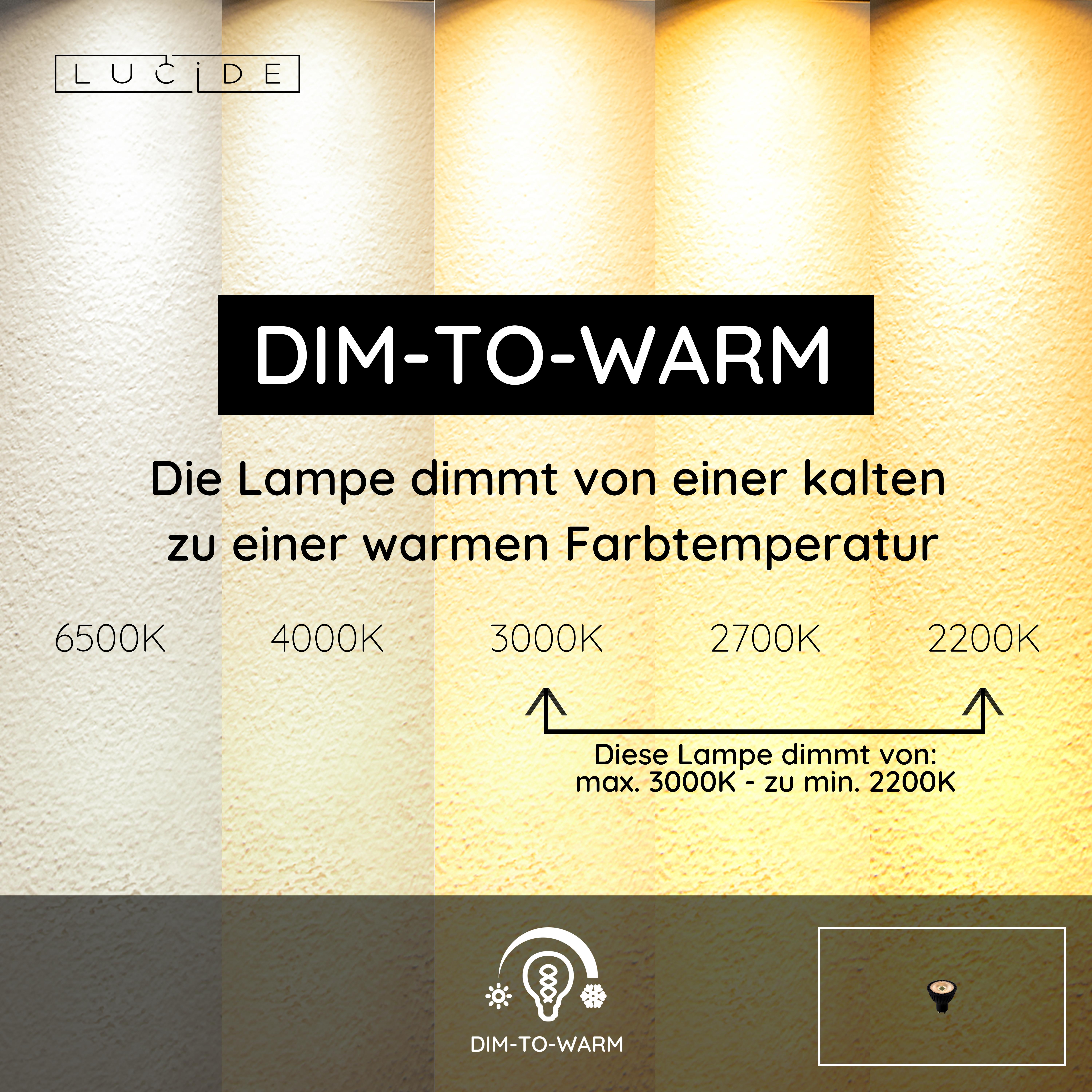 - Dim to warm, dimmbar zu wärmeres Lichtfarbe (2200K)