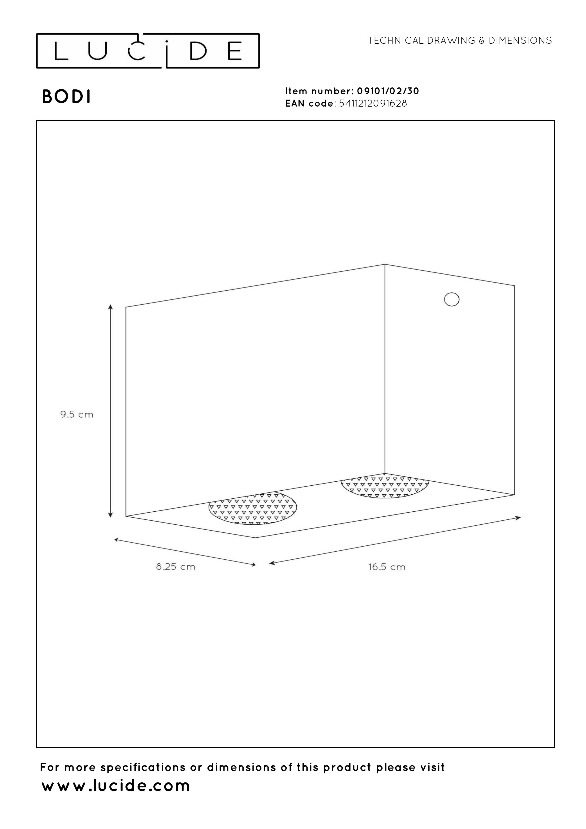 The mounted spot light Bodi 2-light from Lucide is made fully of aluminium and thus has a very high-quality look and feel. With a size of 8.25cm x 16.5 cm, it is easy to place over a central box. This article is particularly suitable as light in a small hall or toilet. Placed in series, the Bodi is also perfect to use above, for example, a bar or a kitchen counter. The Bodi is fitted with a GU10 high-voltage fitting and is delivered without a light source. You have the choice of using a dimmable or non-dimmable GU10 LED spot or a traditional dimmable GU10 halogen spot. The Bodi is available in the colours of aluminium, white and black.