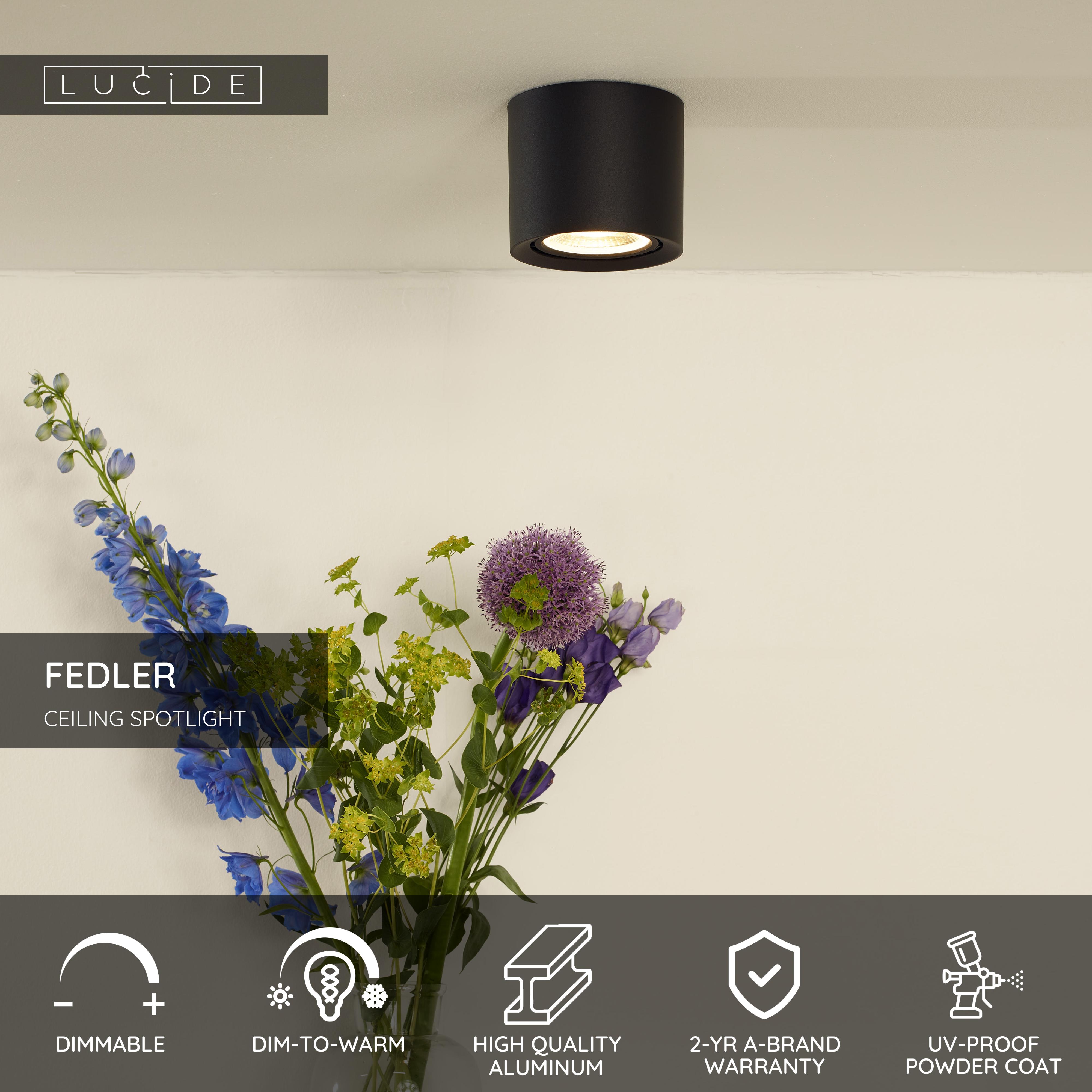 Ceiling spotlight Fedler is compact, geometrically perfect, has a modern appearance and a diameter of barely 12 centimetre. You can control the intensity of the included dim-to-warm led bulb by yourself after connecting the light to a dimmer (not included). Together with the intensity of the light, you can also change the colour temperature (3000K-2200K). Fedler is manufactured with high quality aluminium. You will enjoy a stylish and lightweight design. This also makes attaching the light to the ceiling very easy. Are you going to place multiple in a row or are your creating your own pattern of light?