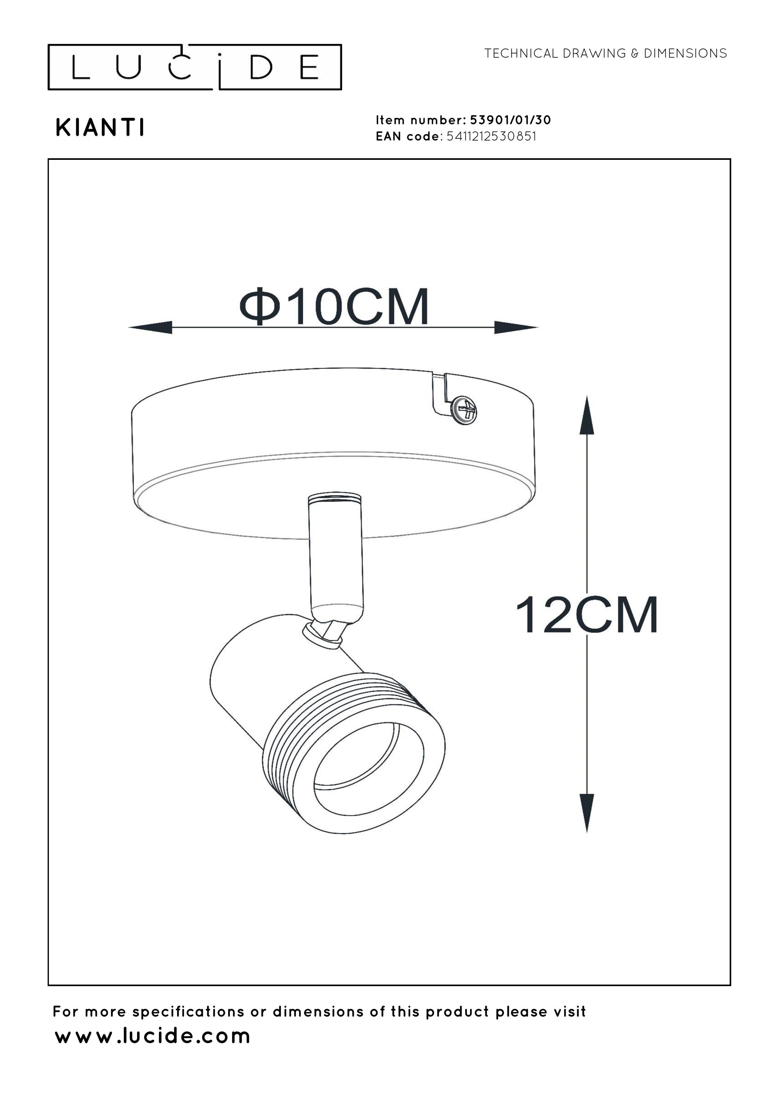 The Lucide KIANTI Ceiling Spotlight combines style and functionality in a compact design. With a diameter of 10 cm and a height of 12 cm, this minimalist wall lamp fits perfectly into any modern interior. The matte black finish and durable metal construction exude sophistication. The adjustable lamp head provides versatile lighting, ideal for accentuating specific areas or creating a warm atmosphere. Suitable for an LED light source (GU10) and compatible with a dimmer (not included), the KIANTI offers the perfect balance between elegance and ease of use. Add a luxurious touch to your living room, kitchen, or hallway with this stylish wall spotlight. Illuminate your interior with the versatile Lucide KIANTI!