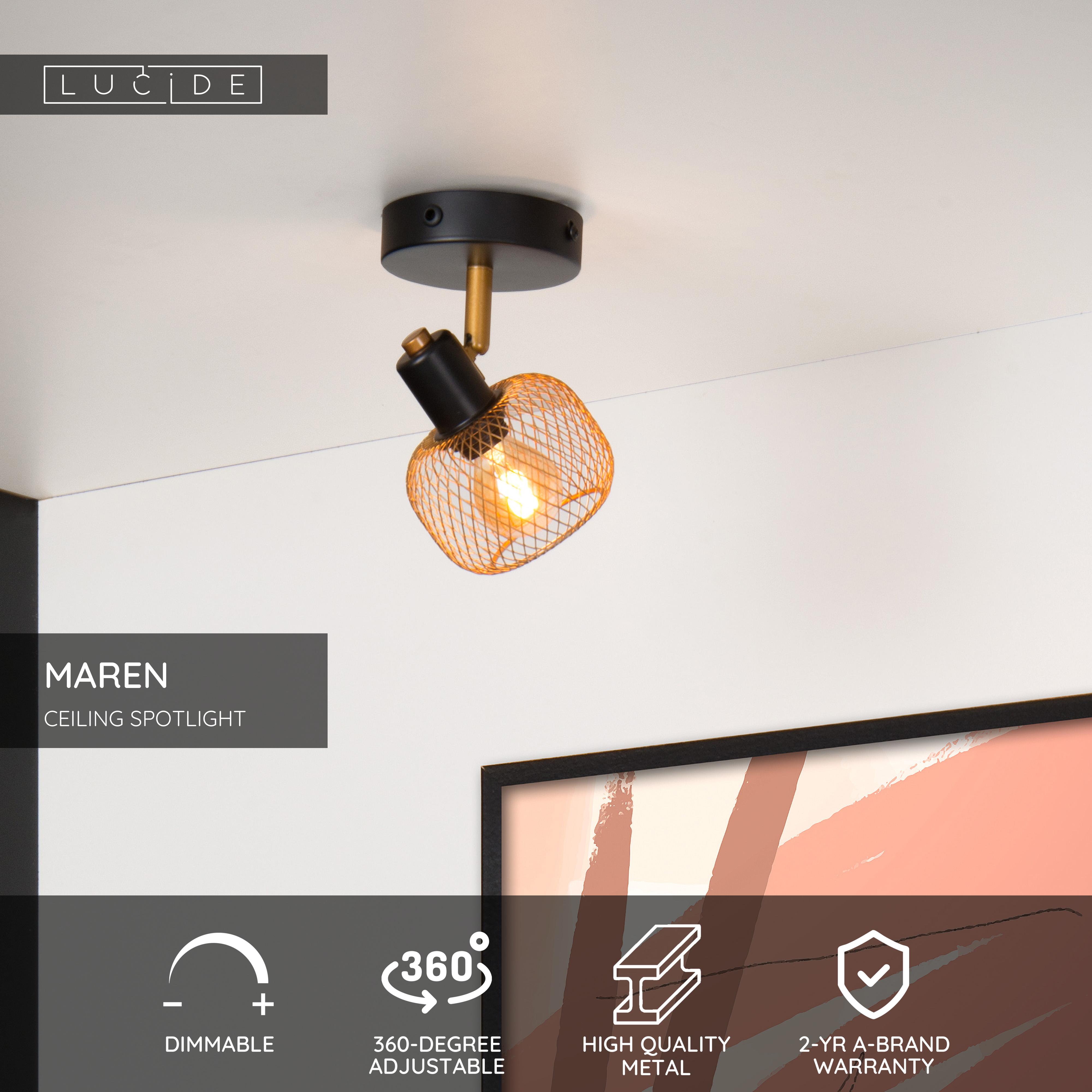 Anyone who says that a wall spotlight is basic clearly does not know Maren. This wall spotlight translates a classic base and dynamic metal grid into a surprisingly retro accent for your interior. Small in size, great in appearance. The light point is surrounded by a fine metal mesh construction. The lamp diffuses its light neatly through the spherical grid. Maren is rotatable and tiltable, so that you enjoy maximum flexibility for your daily lighting needs.
