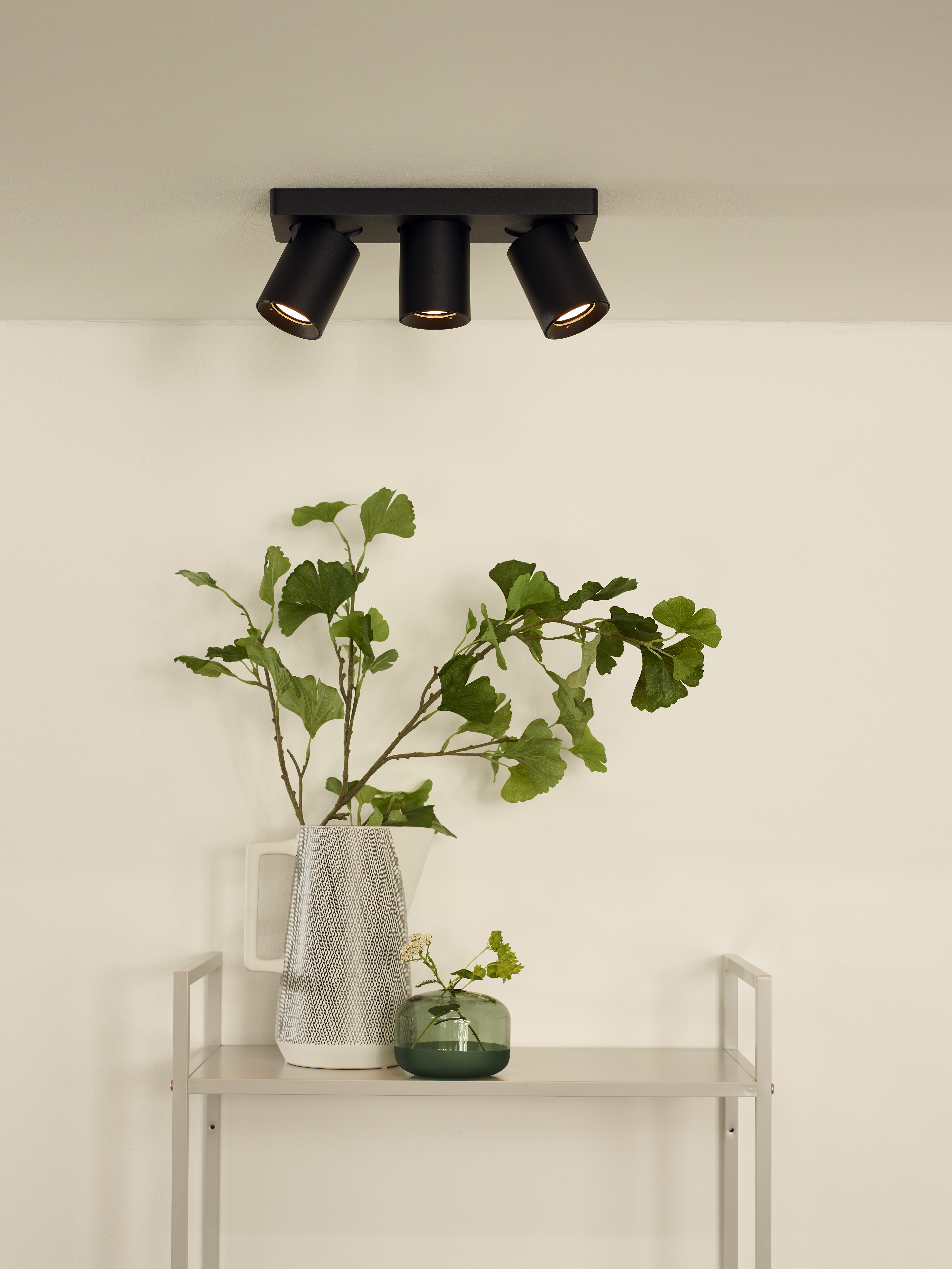 This is Nigel, a ceiling spotlight compatible with three GU10 dim to warm LED-lightsource. This source radiates light from 2200 to 3000k. A simple and timeless design with a cylindrical lampshade that lets the spot feel at home in all kinds of interior styles. Nigel is available in both black and white. And with all kinds of light sources. The white version was given a fun accent by giving the inside of the armature a black colour. The ceiling spotlight is made of aluminium and is 12 centimeters tall. Attach Nigel to your ceiling, connect it to a compatible dimmer, twist and turn the spotlight whichever way you want and enjoy.