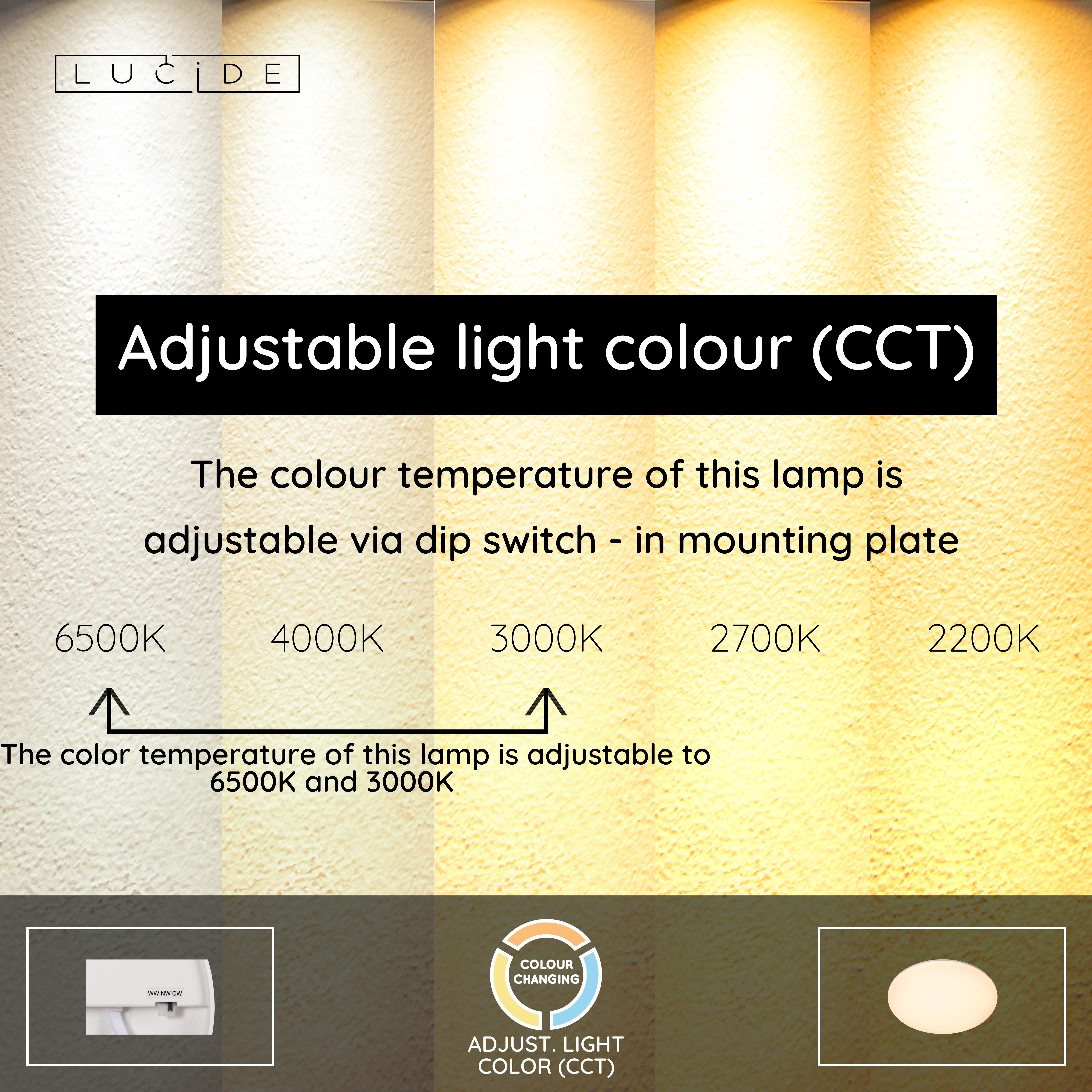- Colour temperature adjustable via DIP switch in mounting plate (3000K-6500K)