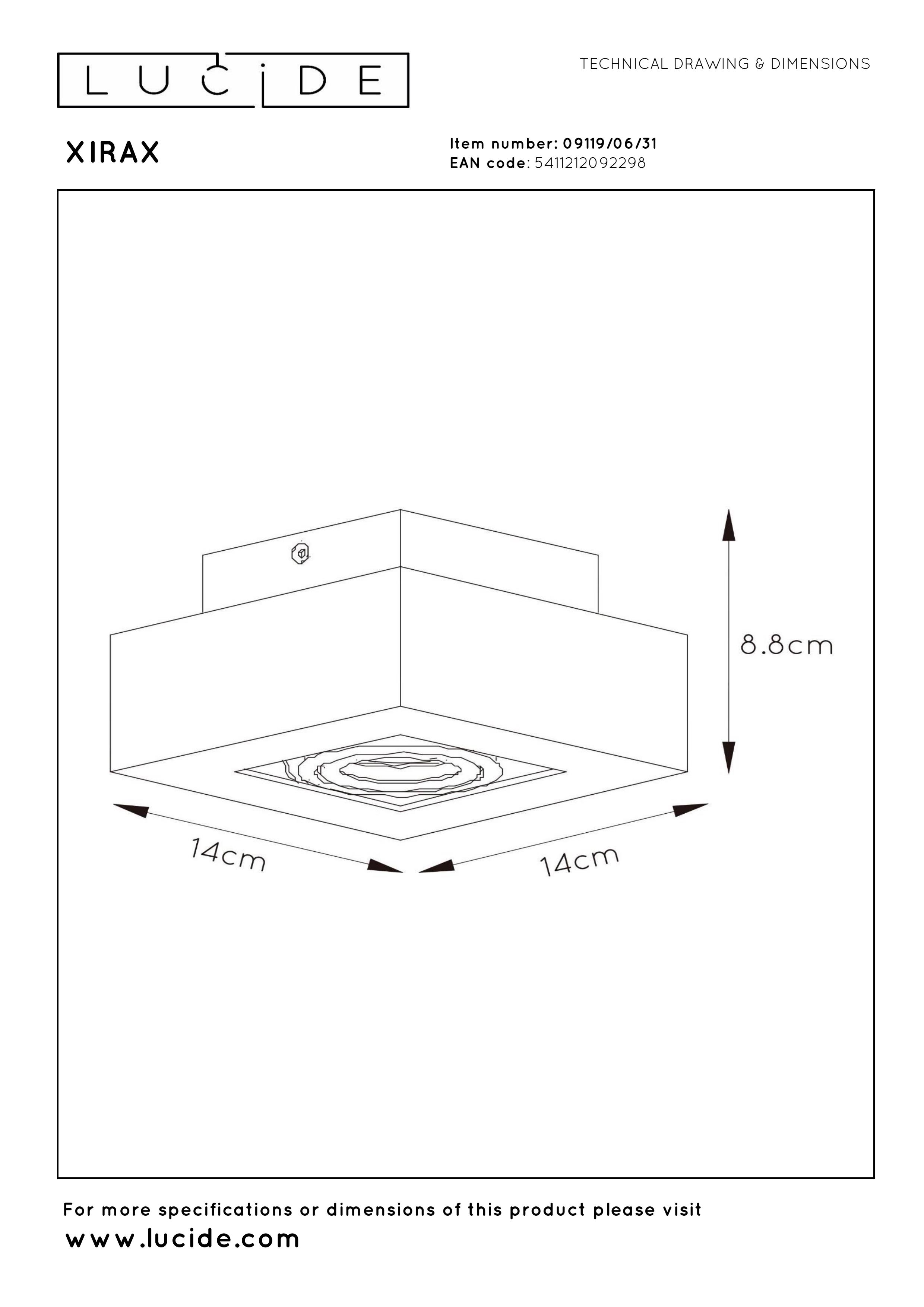 The Xirax ceiling light is a square lightweight of 14 by 14 centimetres. A stylish aluminium frame embraces a GU10 fitting with LED bulb. A powerful light stream of 320 lumen and a dim-to-warm bulb, illuminate your living room from ceiling to floor. This white ceiling light from Lucide integrates itself effortlessly into a modern environment. With a height of 8.8 centimetres, the lighting is barely noticeable. A compact, but still powerful lighting element that surprises everyone.