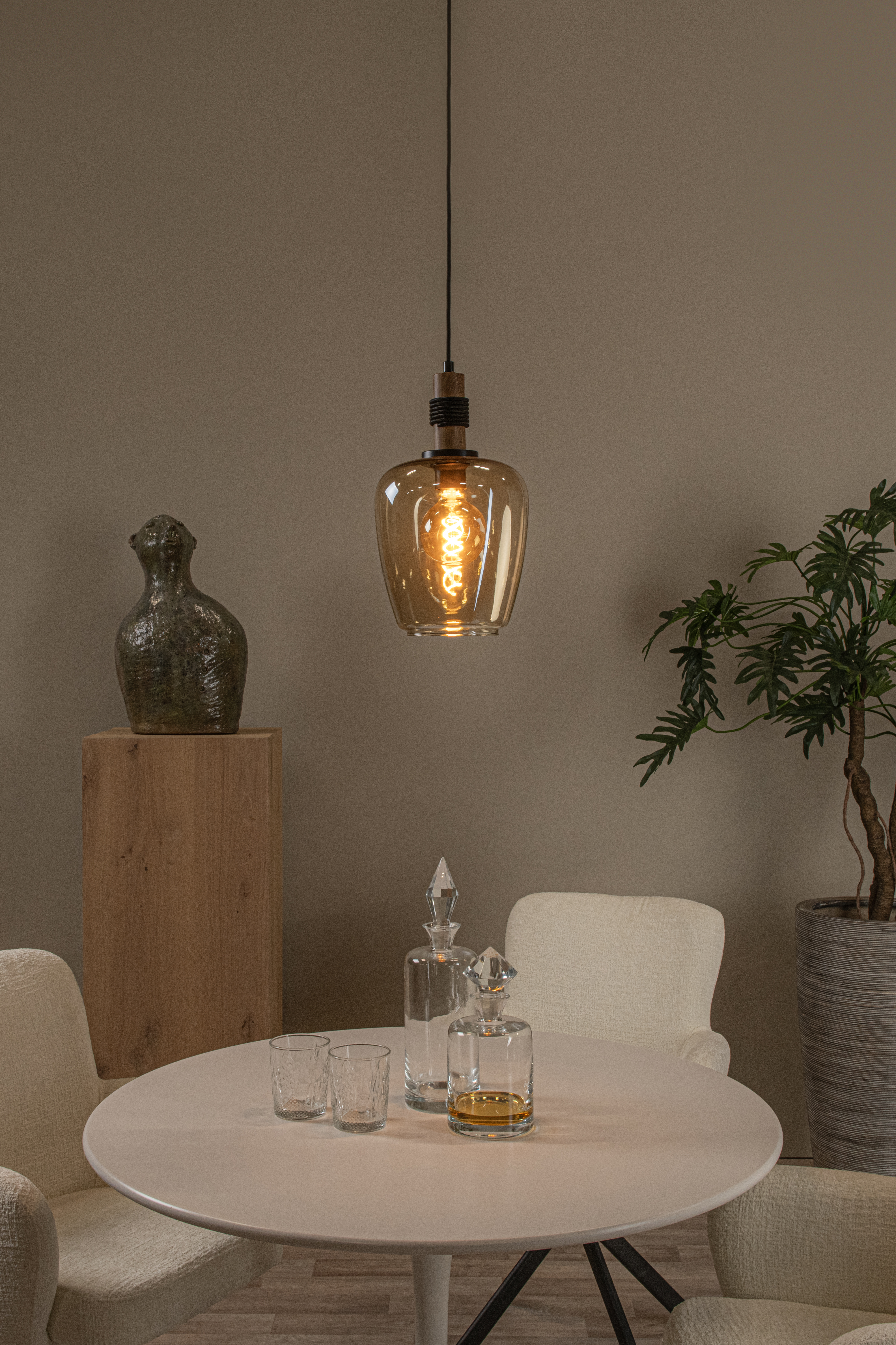 This elegant glass lampshade combines colour with serenity. The elongated pendant in high-quality glass, the slender wooden fitting and the dark textile lamp cable combine different textures to create a harmonious sensory experience. With Ilona, you can create ambience in a dark corner of your living room or make a hallway even more inviting. The pendant can be adjusted to a height of 161 centimetres and has a diameter of 22 centimetres. Why not let it hang directly above your bedside table? Ilona is also compatible with LED light sources and can be easily connected to an external dimmer.