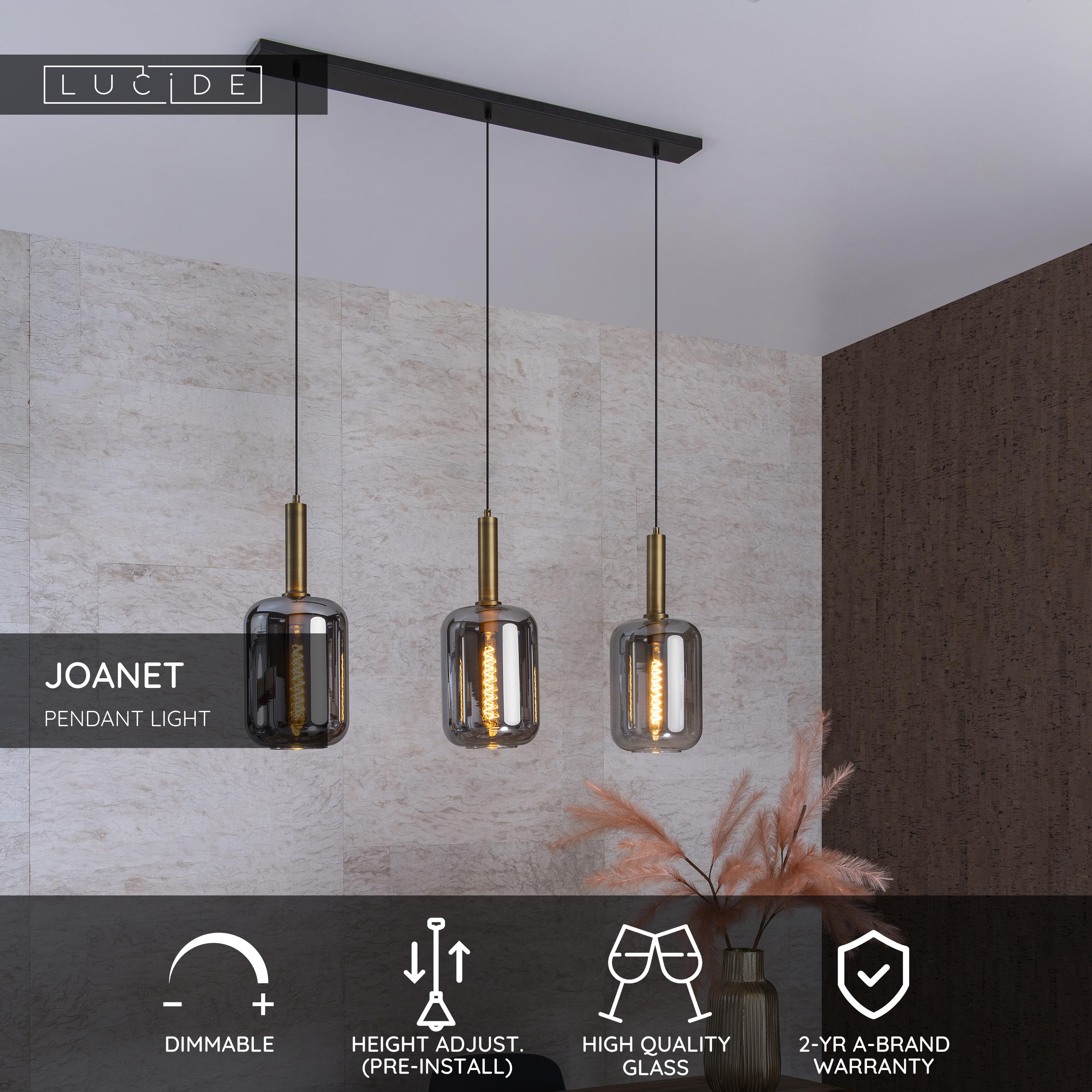 High-quality glass and brass is the ideal formula for stylish design. The pendant light Joanet has understood that well. The elegant shapes and the fumé finish of the glass give this fixture a mysterious side. The light point spreads a pleasant, diffuse glow from the heart of the glass tubular shape. You can easily adjust Joanet in height before attaching the mounting plate to the ceiling. After connecting to a dimmer, this lamp brings even more atmosphere to your modern interior. For every occasion.