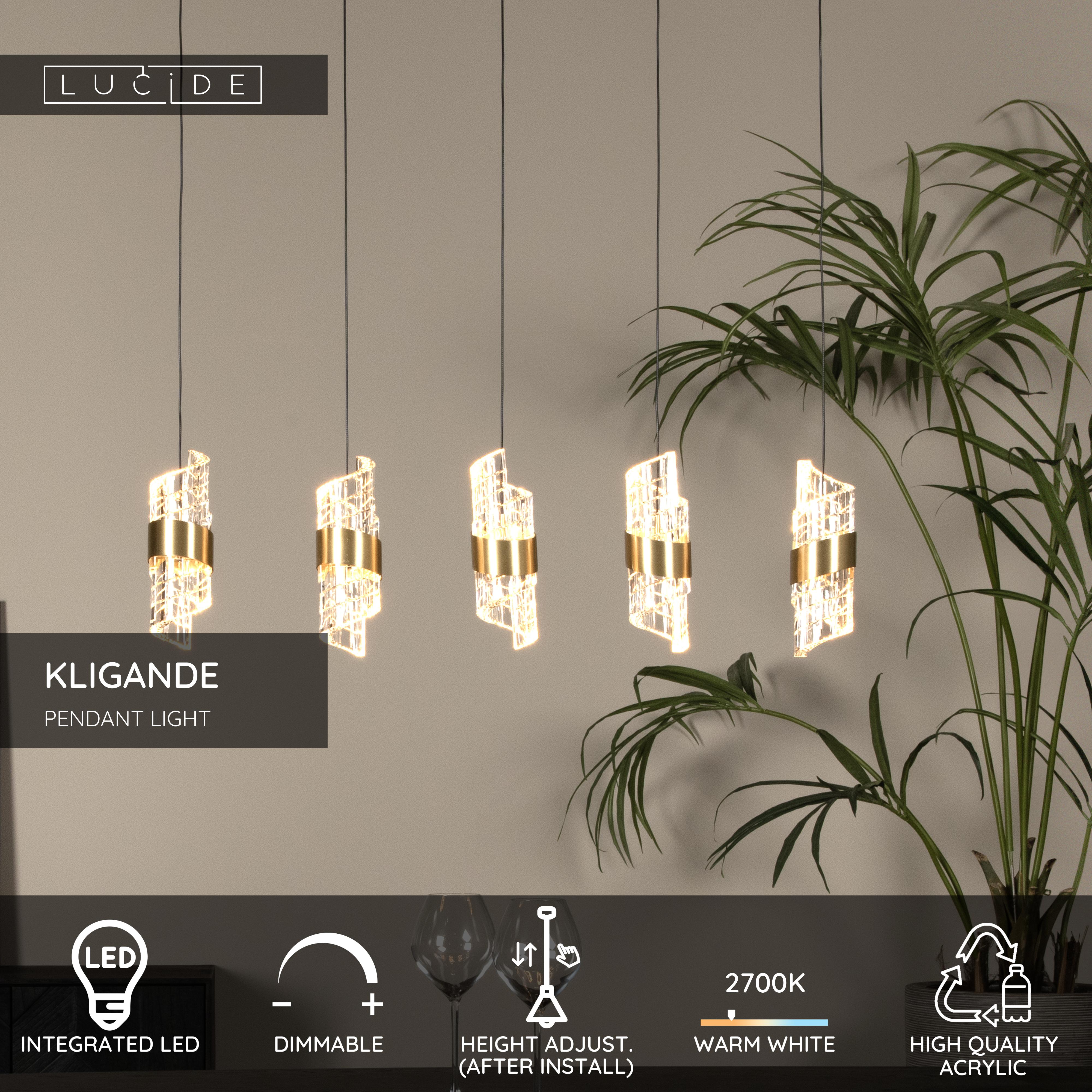 Take your interiors to new heights with Kligande: the ultimate combination of elegance and functionality. This versatile rectangular light fixture has 5 pendant lights and is suitable for any room in the house. Simply connect the pendant to a dimmer to create the perfect ambience for any occasion. Each built-in LED light bulb is surrounded by a high-quality acrylic lampshade finished with a metal band. Enhance your home with this stunning addition.
