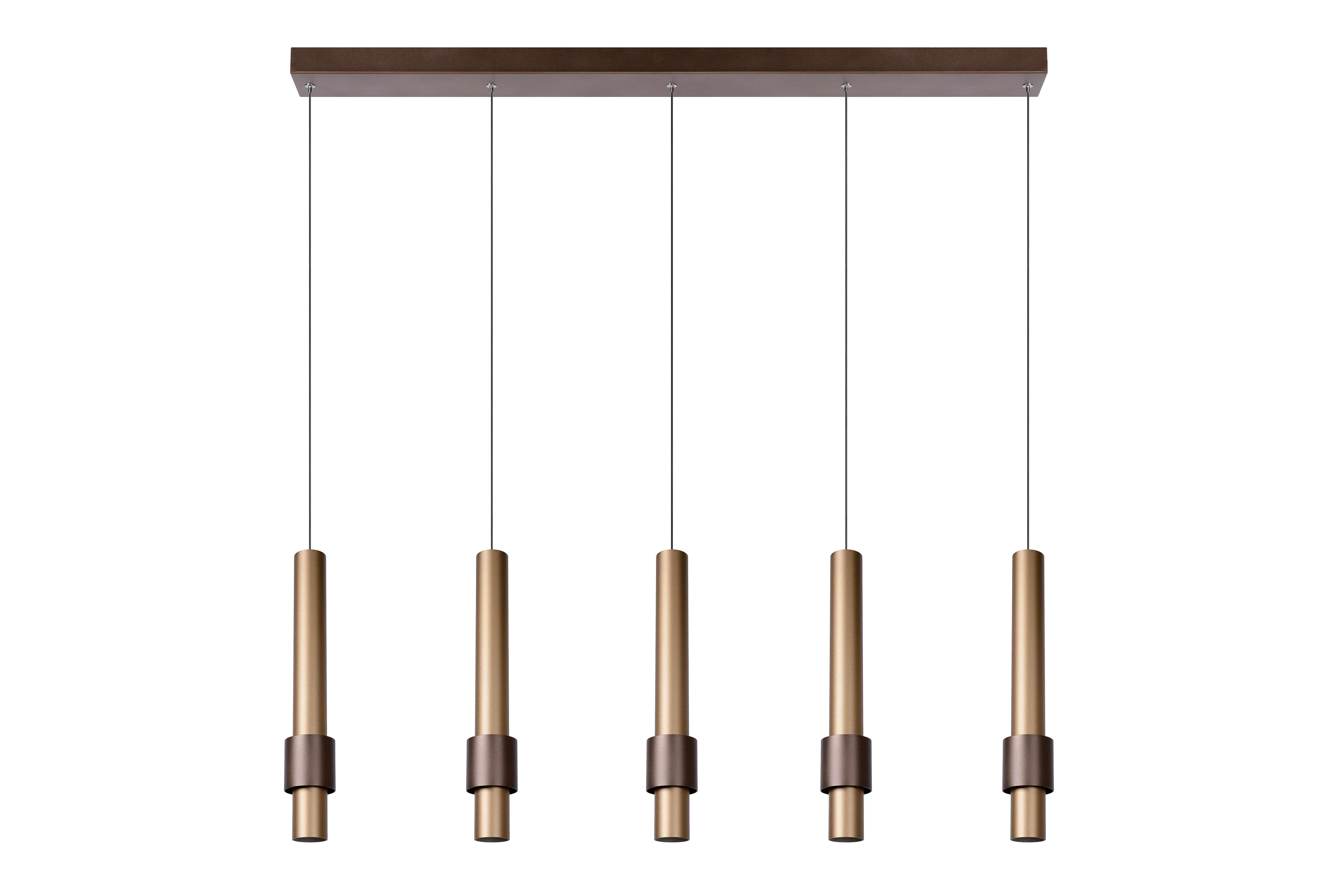 Why limit yourself to 4 light points if you can also choose 5? This hanging lamp called Margary brings a luxurious eye-catcher to your interior. It fits perfectly over the dining table of a contemporary interior, but the sophisticated range of materials and the colour choices blend equally in more of a rural style. The aluminium mounting plate forms the basis for the 5 slender pendants. On each of them hangs a slightly conical aluminium cylinder that incorporates the light points. In the plural, indeed. Because in addition to a downlighter at the bottom of the cylinder, a second integrated LED bulb folds around the elegant tube. In turn, surrounded by a second cylinder. The sophisticated design of these shapes and their relationship create a mysterious glow. The result is an instant eye-catcher with star power.