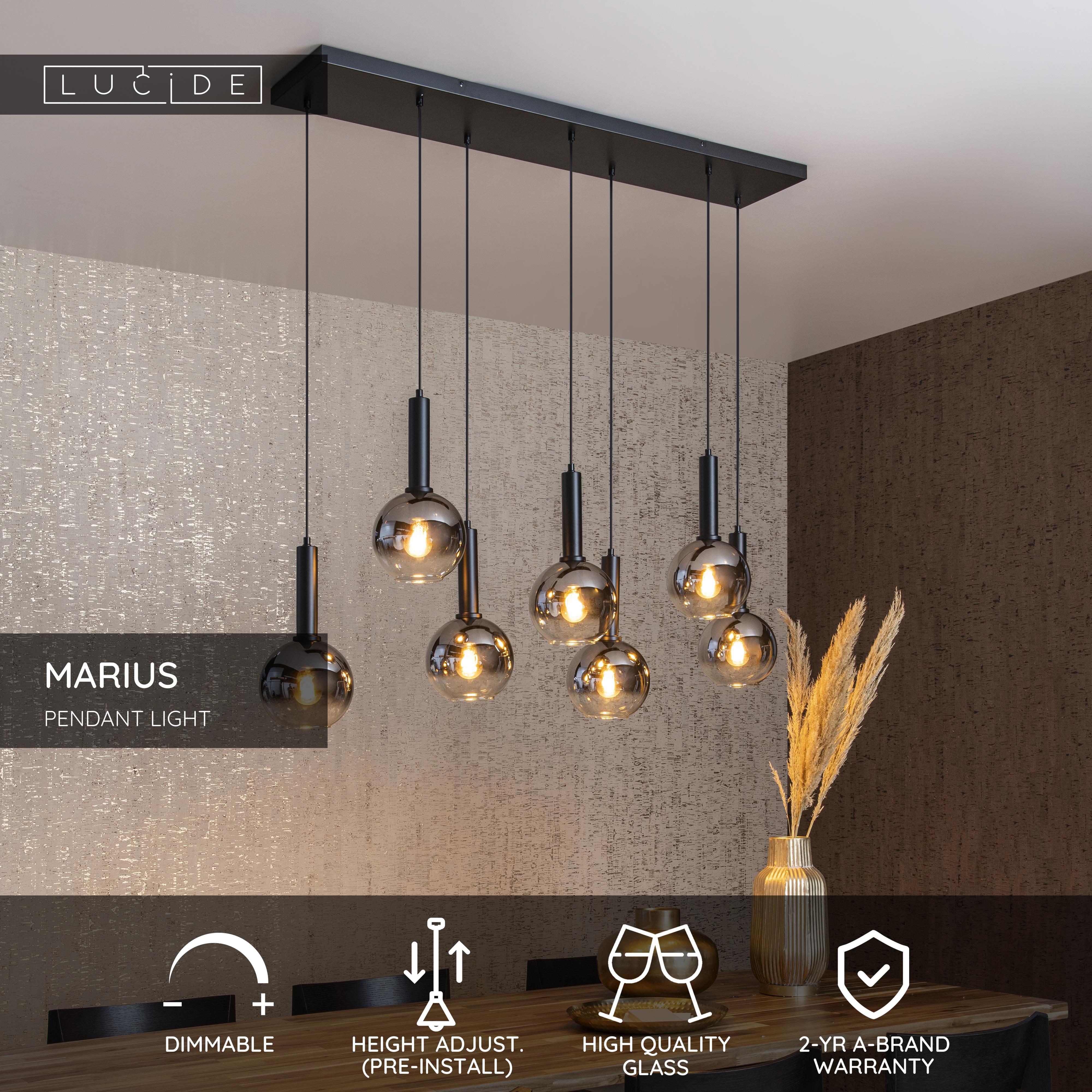 The spherical glass lampshades on Marius keep you and your tablemates company in style. This modern pendant light combines high-quality materials such as elegant fume glass and metal to create a substantial eye-catcher. And that may be taken literally. The length of this chandelier is 130 centimetres and the height can be adjusted from 70 to 150 centimetres. Connect Marius' 7 light sources to a dimmer and make everyone feel right at home, at any time of the day.