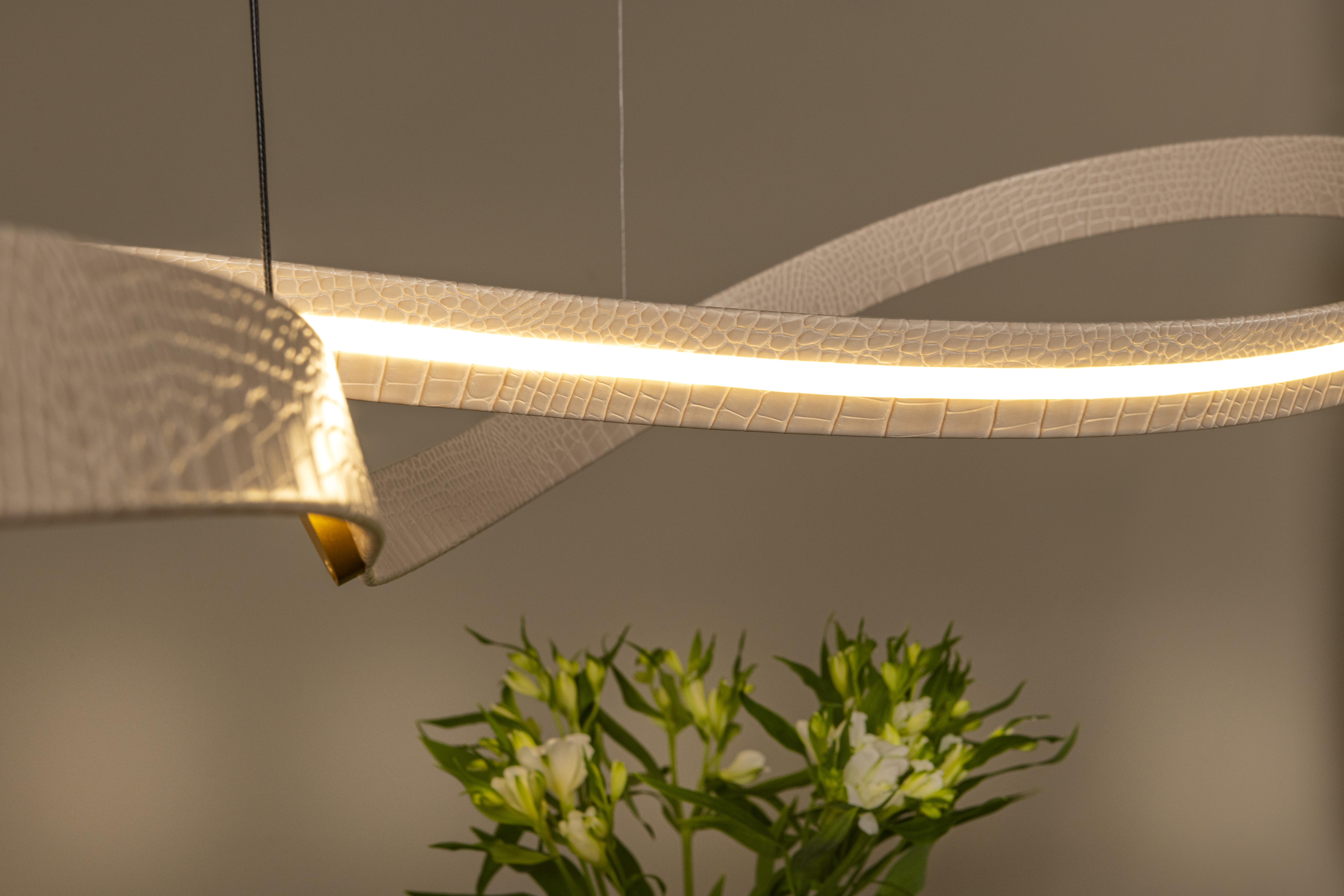 Graceful curves meet cutting-edge performance in SLALOM, a Premium pendant light designed to elevate modern interiors. Its integrated 80W LED emits an adjustable light color between extra warm white (2200K) and cooler tones (up to 4000K), letting you tailor the atmosphere to every moment. The soft beige and matt gold tones exude understated elegance, while the height-adjustable feature (before installation) ensures visual harmony above dining tables or kitchen islands. The ceiling plate has a diameter of 20 cm. With a width of 61 cm, a depth of 161 cm, and a height of 181.5 cm, SLALOM makes a bold yet refined statement. Add this design piece to your home today.