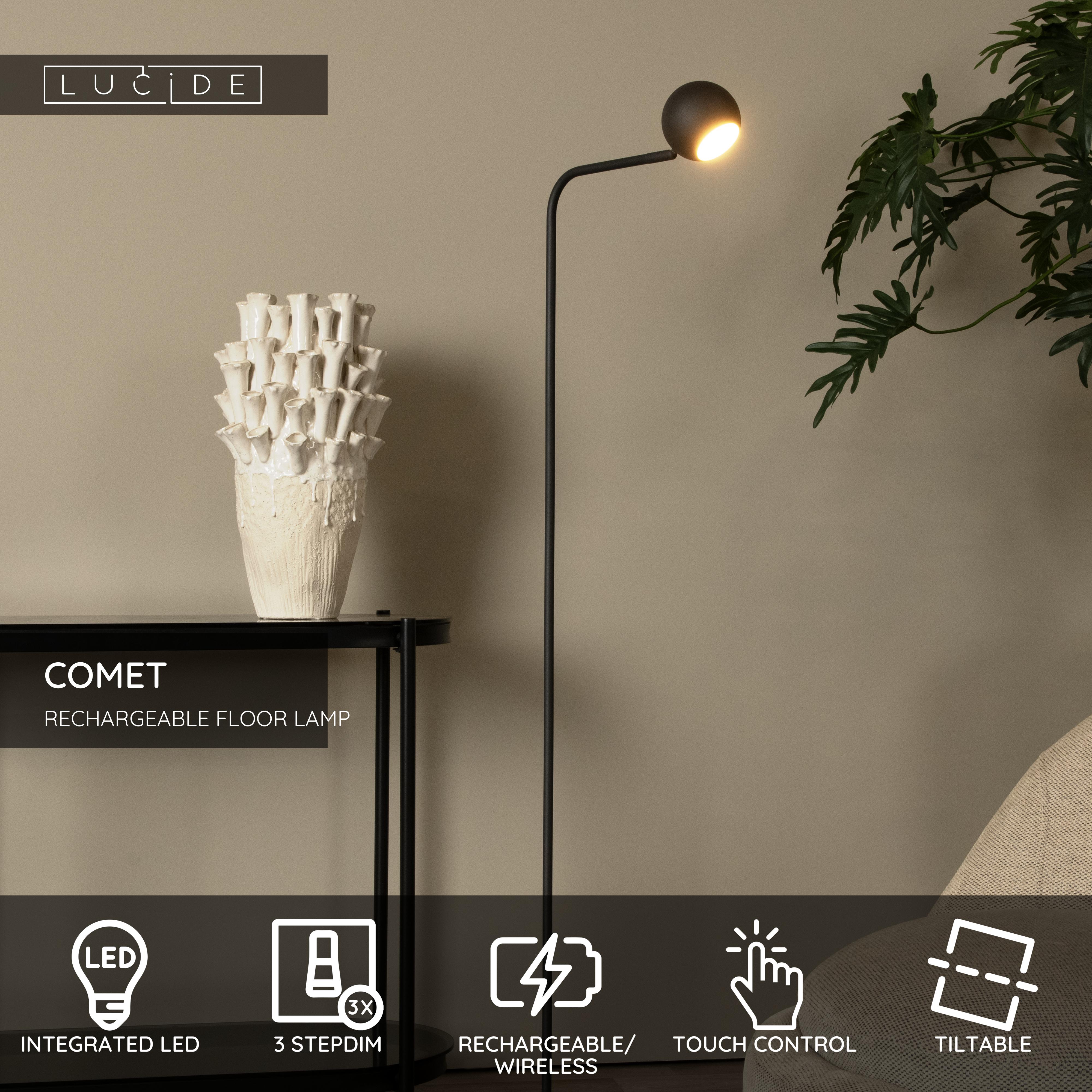 Lucide COMET - Rechargeable Floor lamp - Battery pack- LED 3 StepDim - 1x3W 2700K - Black