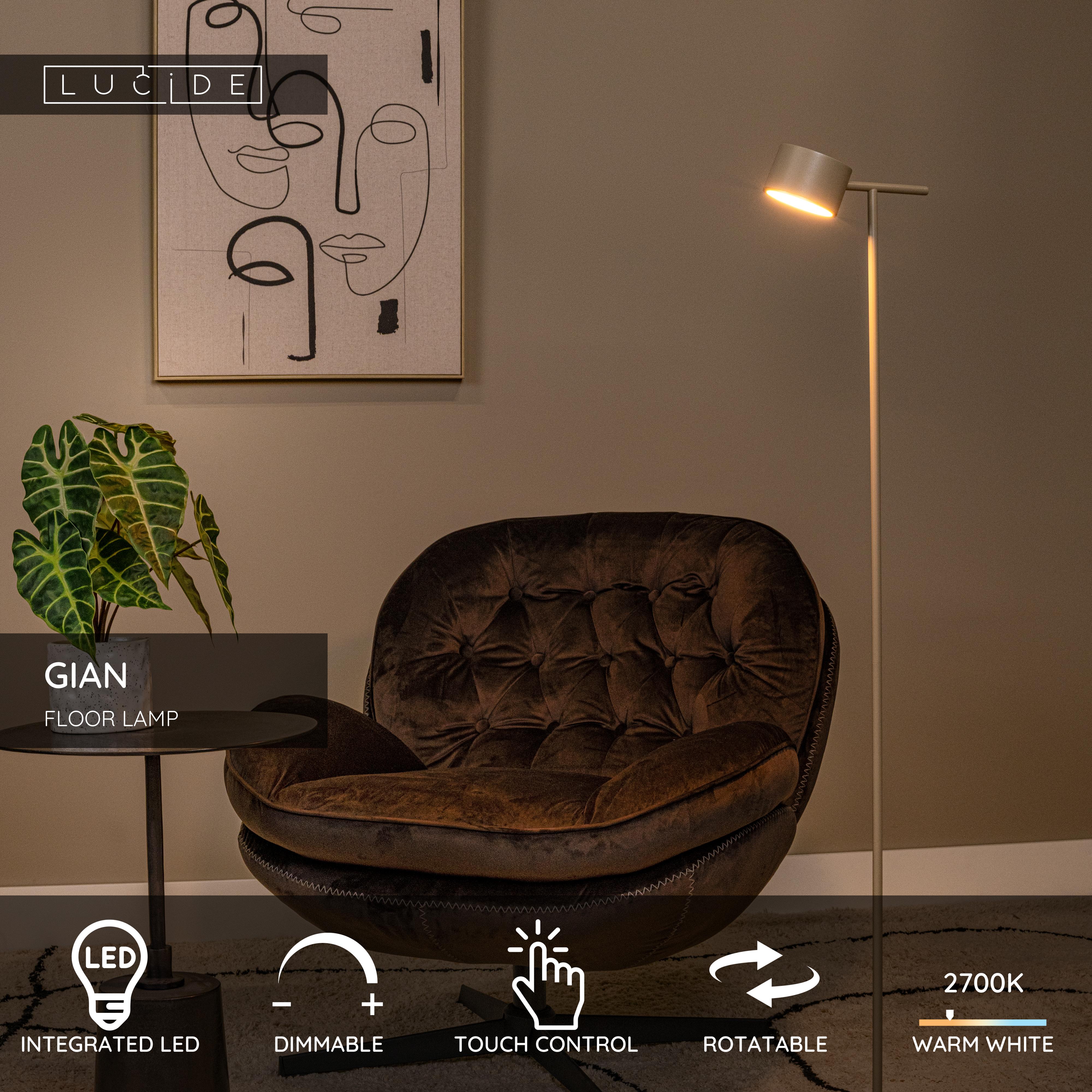 The Lucide GIAN floor lamp exudes contemporary elegance with its taupe metal finish and modern design. With a height of 130 cm and a base diameter of 26 cm, this lamp is ideal for ambient lighting in living and workspaces. Thanks to the integrated dimmable LED light source (2700K), it provides warm white light that is easily controlled via the built-in touch dimmer. The swivel function allows you to direct the light where needed. Add a stylish and practical element to your interior with the versatile GIAN floor lamp.