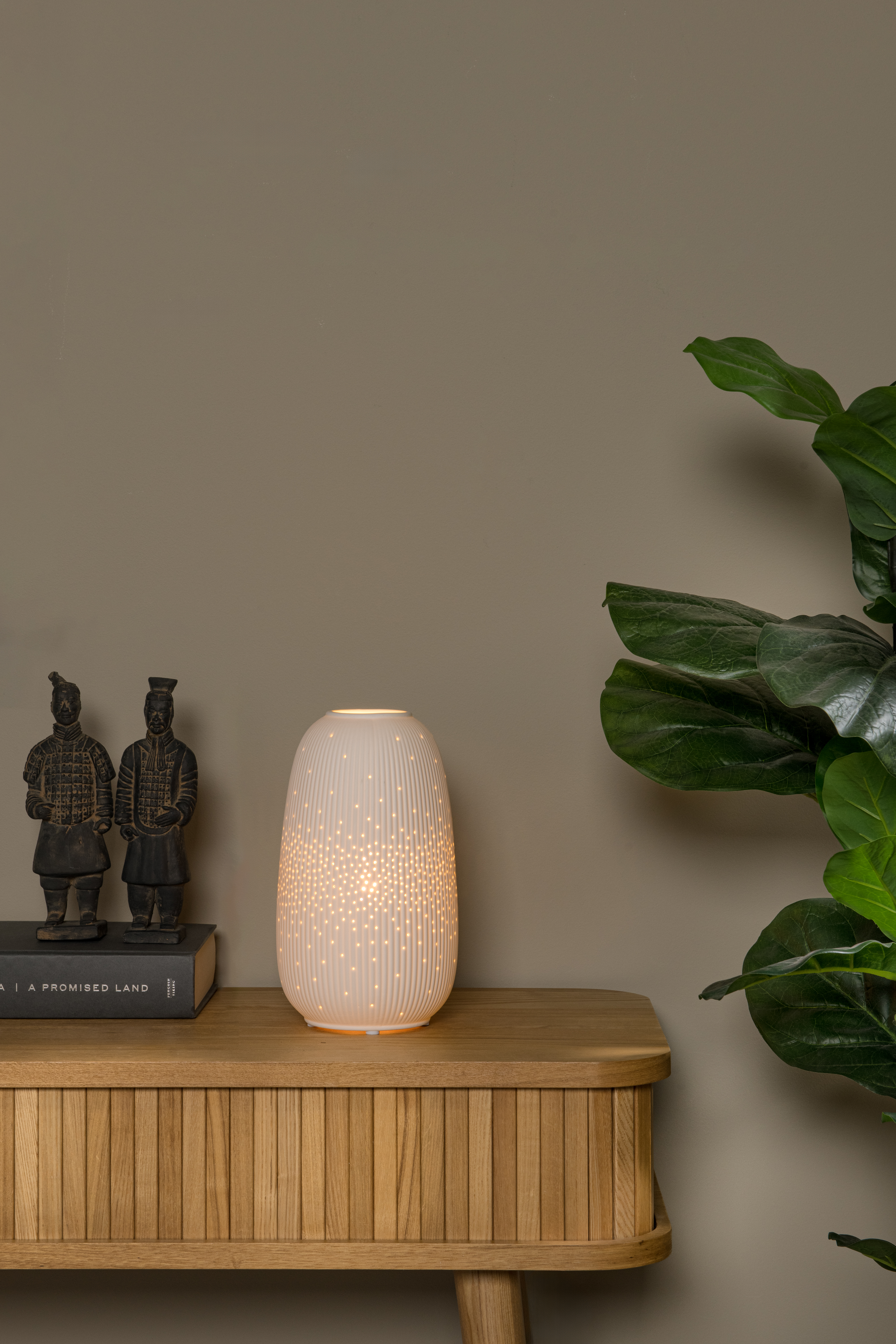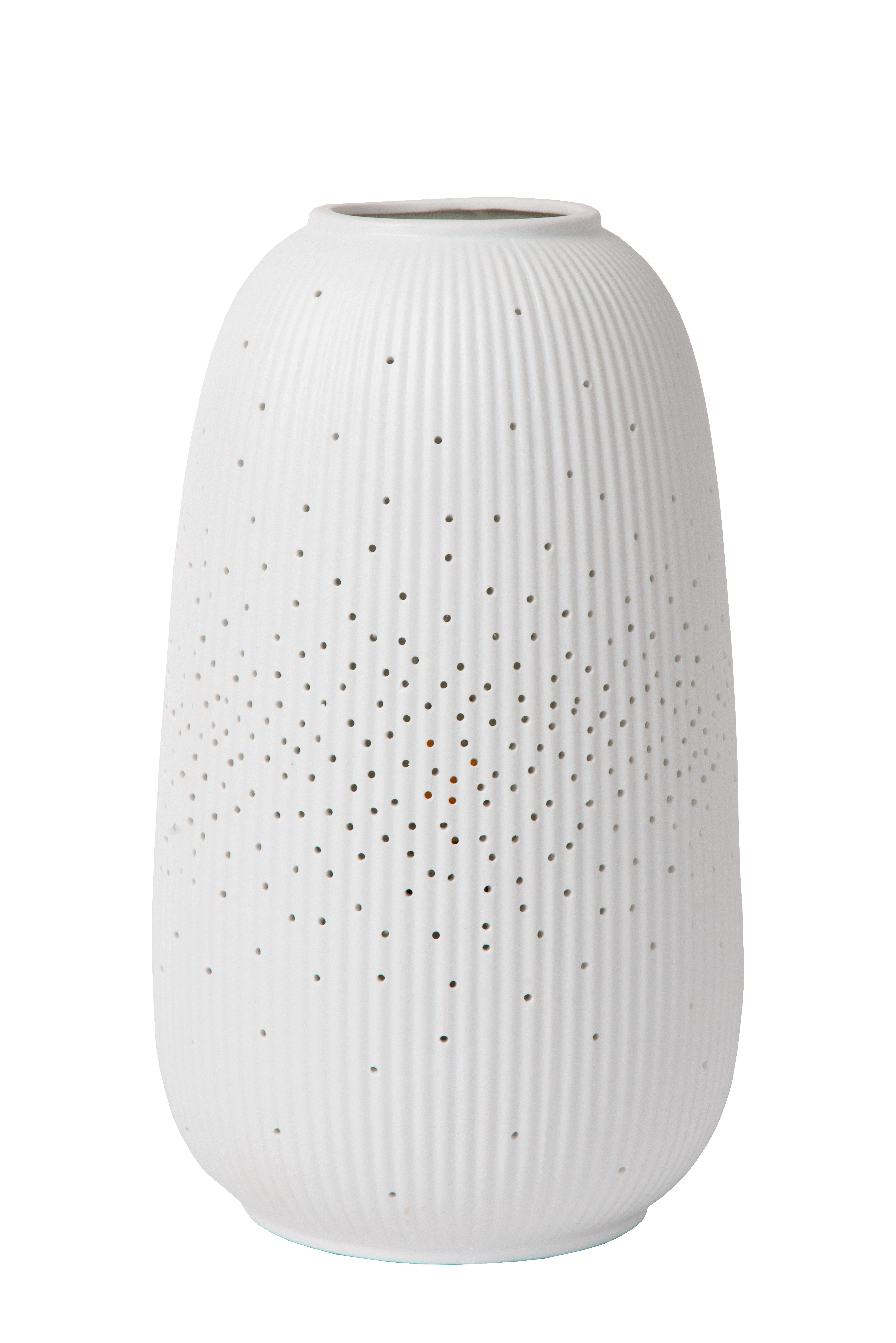 Surprise your family and guests with this original lamp that looks like a luxurious vase. Flores exudes simplicity and elegance. The elongated shape of this porcelain table lamp will make a graceful appearance whether it's on your coffee table, dresser or side table. Simply turn Flores on with the switch on the cord, and it will almost seem as if the lamp is putting on a colourful dress. The delicate round openings in the body allow light to playfully spill out. Flores is approximately 24 centimetres high and 14 centimetres wide and can be fitted with an LED light bulb.