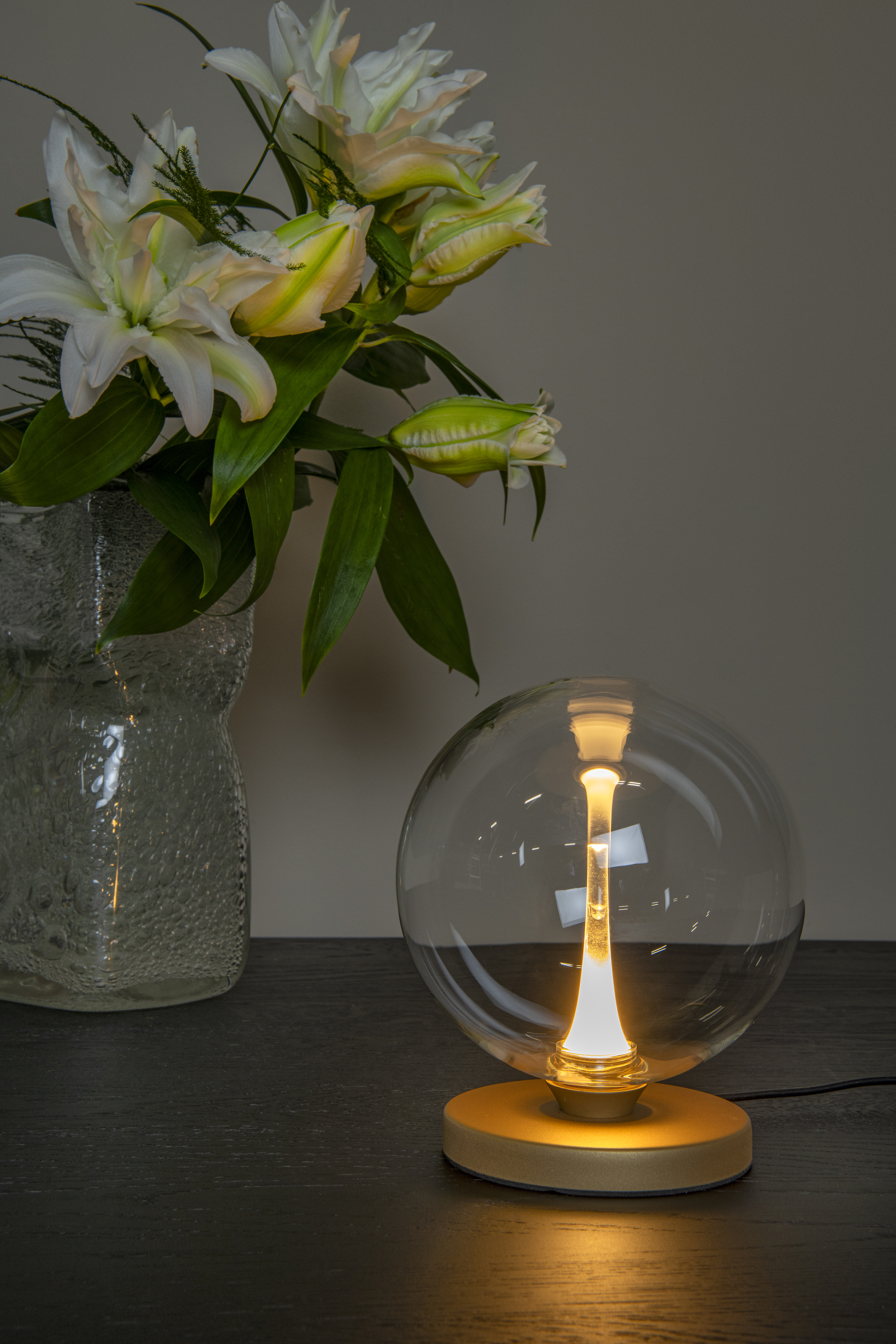 Are you looking for a mood setter that is compact, powerful and yet easy to use? Gisela is a no-brainer. The clear glass sphere with integrated LED bulb rests on an elegant, slim base. Simply switch the table lamp on or off via the switch on the cord and immediately enjoy the warm, white light that Gisela sends out. It feels completely at home in a modern interior, from the living room to the bedroom or as a mood setter in the hall.