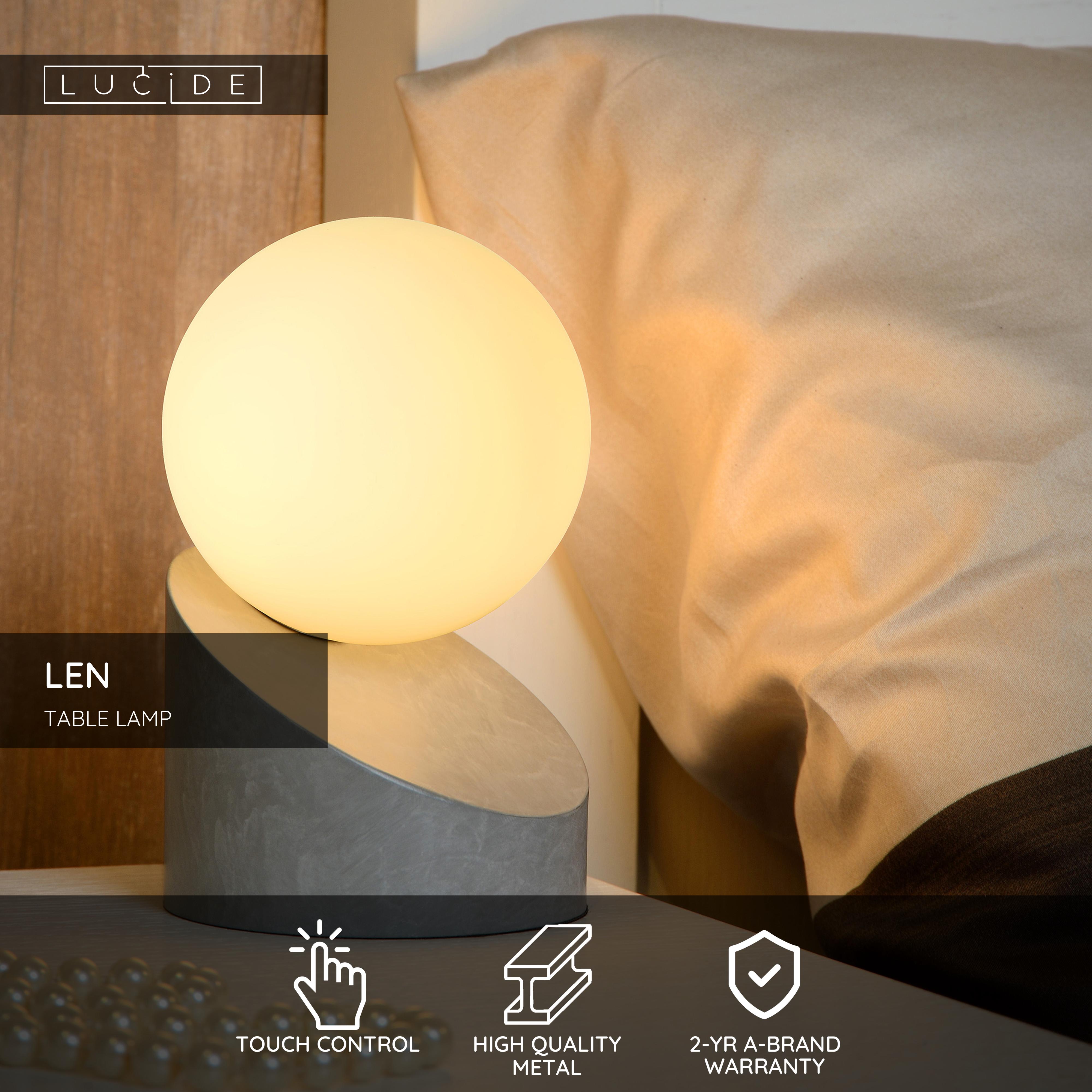 Table lamp Len flirts with gravity. The orb of light in opal glass seems to hover over its metal base. An illusion that briefly fools any visitor. Thanks to the built-in touch switch, the lamp base has a perfectly smooth finish. This table lamp is sure to be the eye-catcher of your modern interior. The glass orb spreads the light evenly, ensuring you of sufficient light in any space. Len comes in various colours.