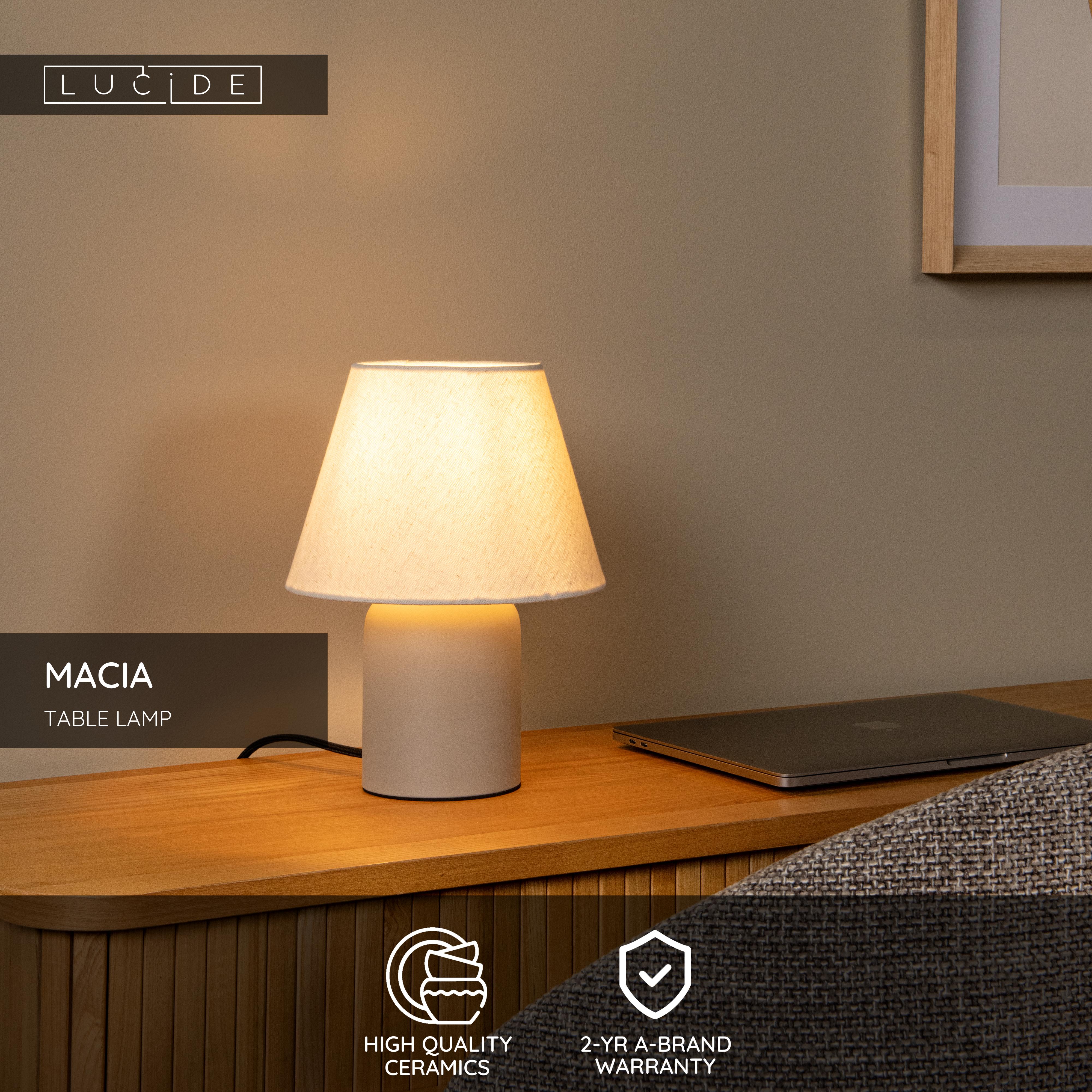 The Lucide MACIA table lamp adds a natural and refined touch to your interior. With its stylish ceramic base and beige linen shade, this lamp exudes timeless elegance. The conical shape of the shade and compact dimensions of 27 cm in height and 20 cm in width make it an ideal choice for a nightstand, desk, or dresser. The lamp is easy to operate with an on/off switch on the cord and is suitable for LED light sources (E14, not included). Illuminate your home in style with the versatile and decorative MACIA table lamp!