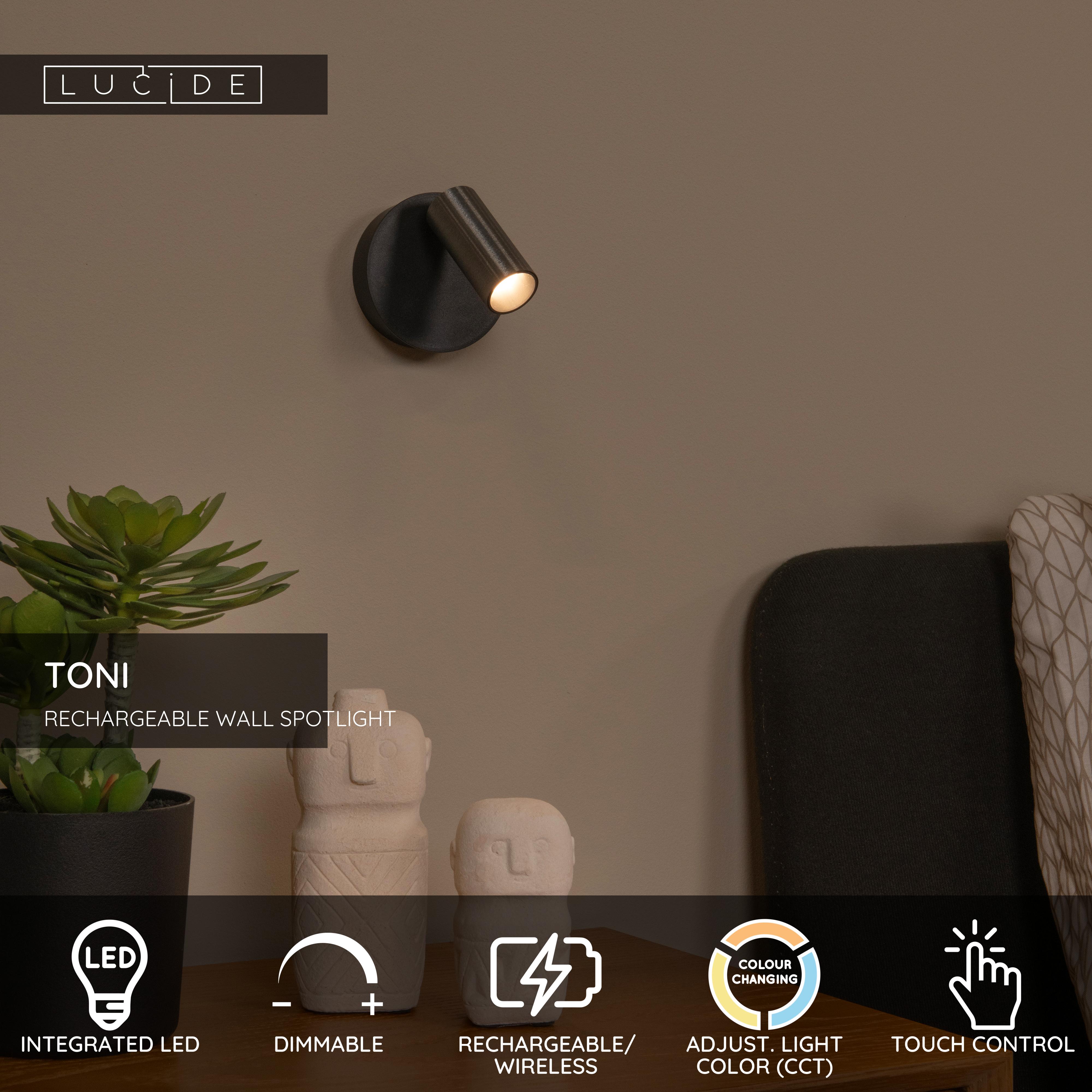 Lucide TONI - Rechargeable Wall spotlight / Wall light - Battery pack - Ø 8,1 cm - LED Dim. - CCT - 1x2W 2700K/4000K - Magnetic - Grey iron