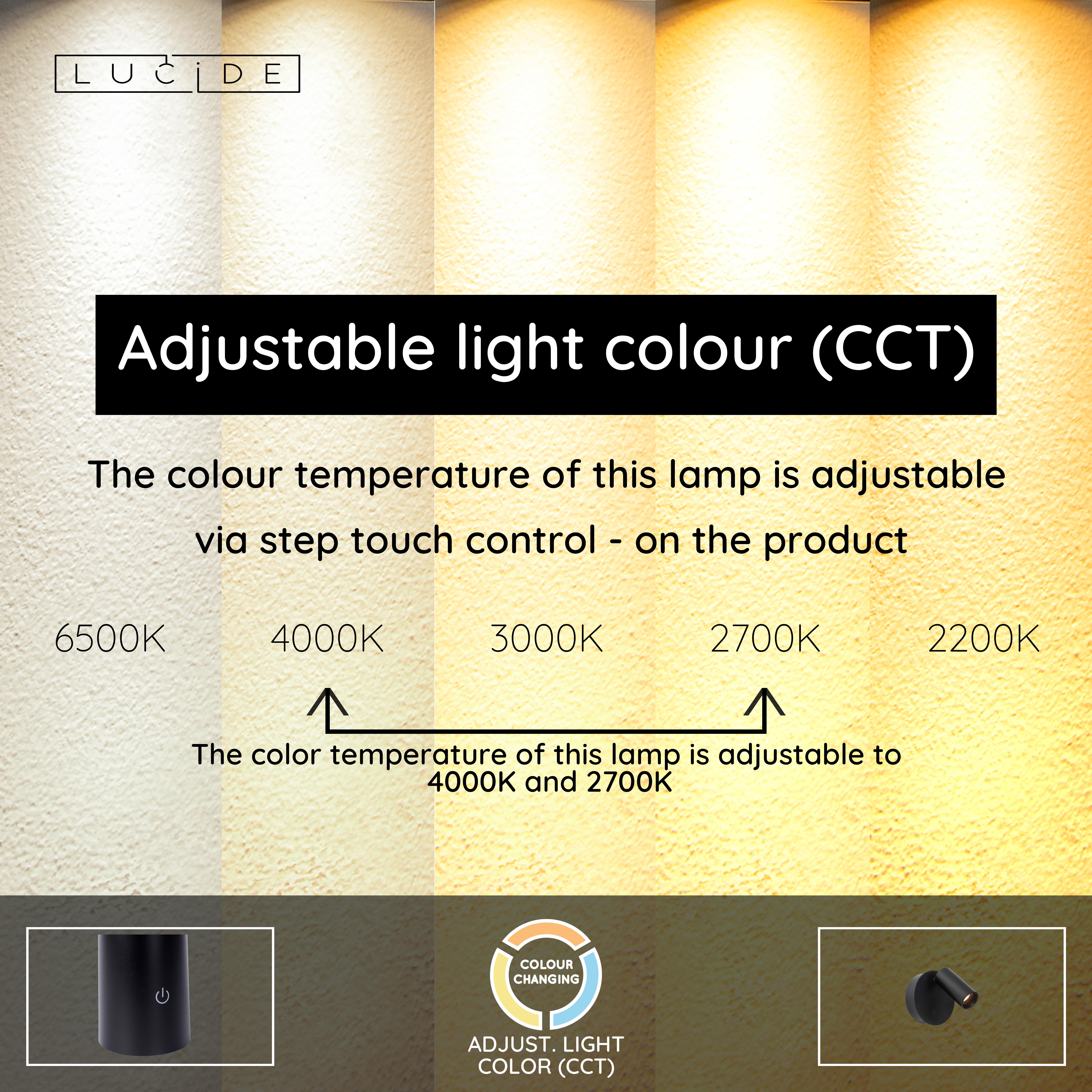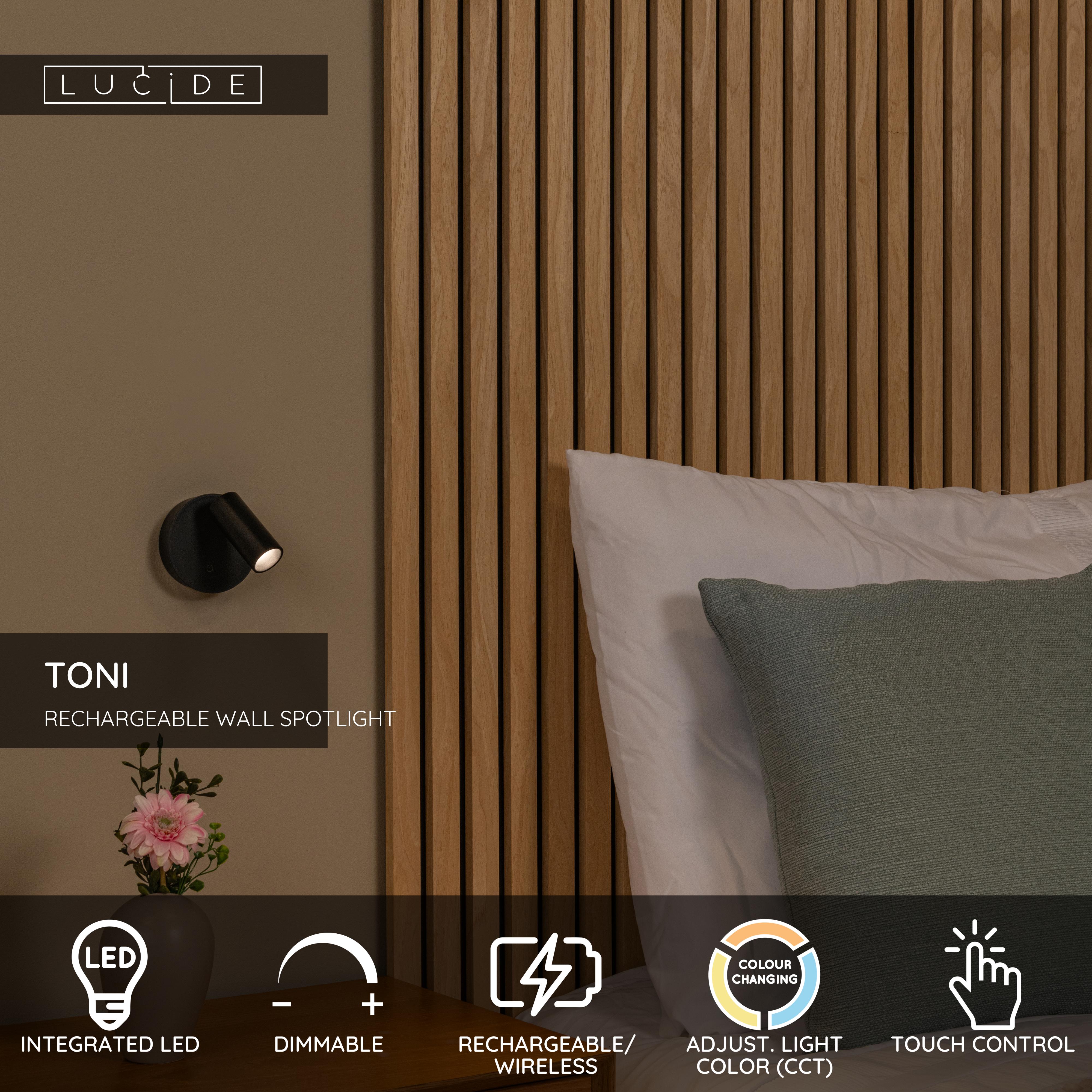 Lucide TONI - Rechargeable Wall spotlight / Wall light - Battery pack - Ø 8,1 cm - LED Dim. - CCT - 1x2W 2700K/4000K - Magnetic - Black