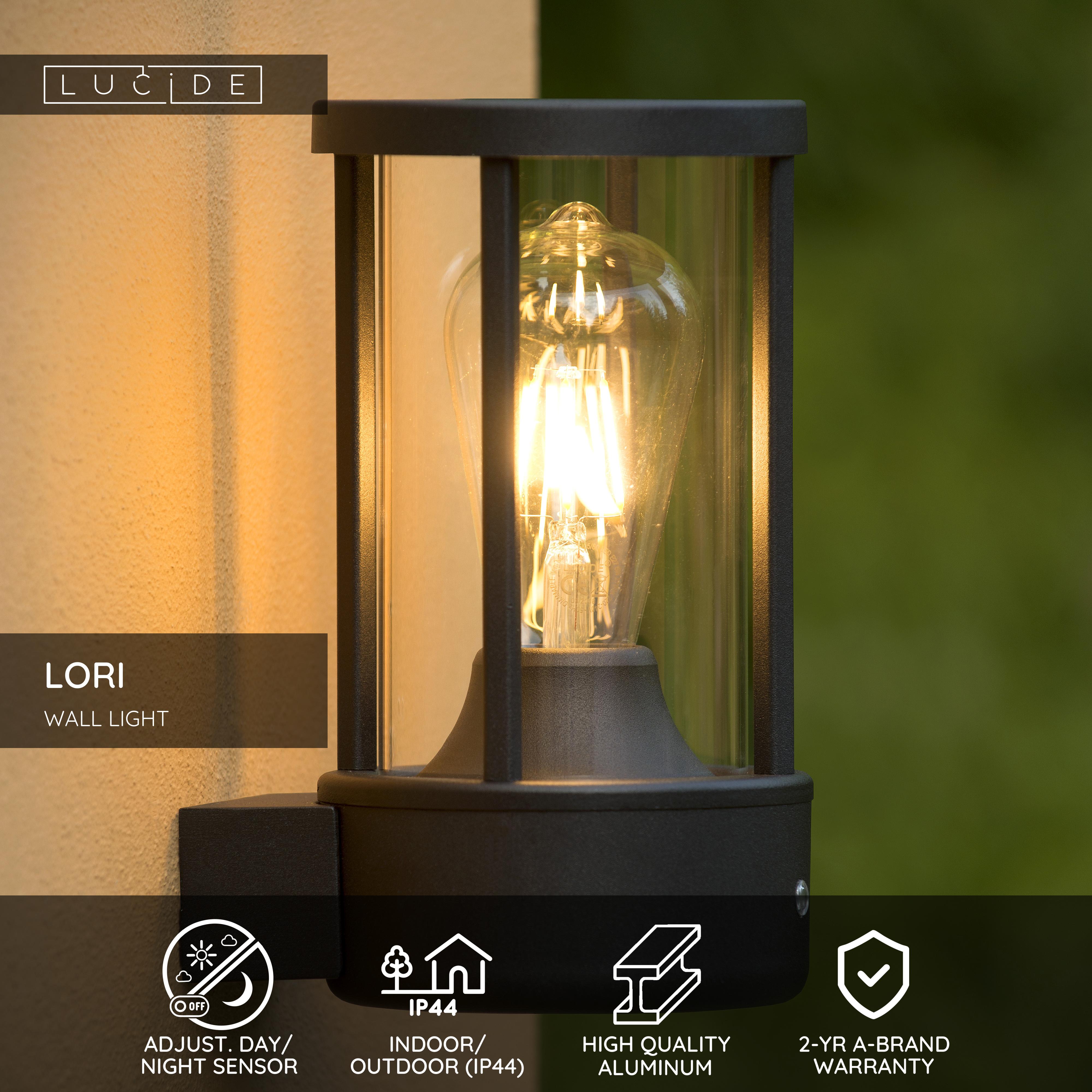 A modern wall light for your front door or to light up your garden. This wall light named Lori feels right at home on the façade of your home or garden house. A day/night sensor operates the lamp, always giving you the correct lighting. The luminaire is made of high-end aluminium and was specially designed for outdoor applications. It retains its stylish look, even in harsh weather conditions. A filament light bulb (not included) makes the most out of this lamp, thanks to the glass lampshade finish.