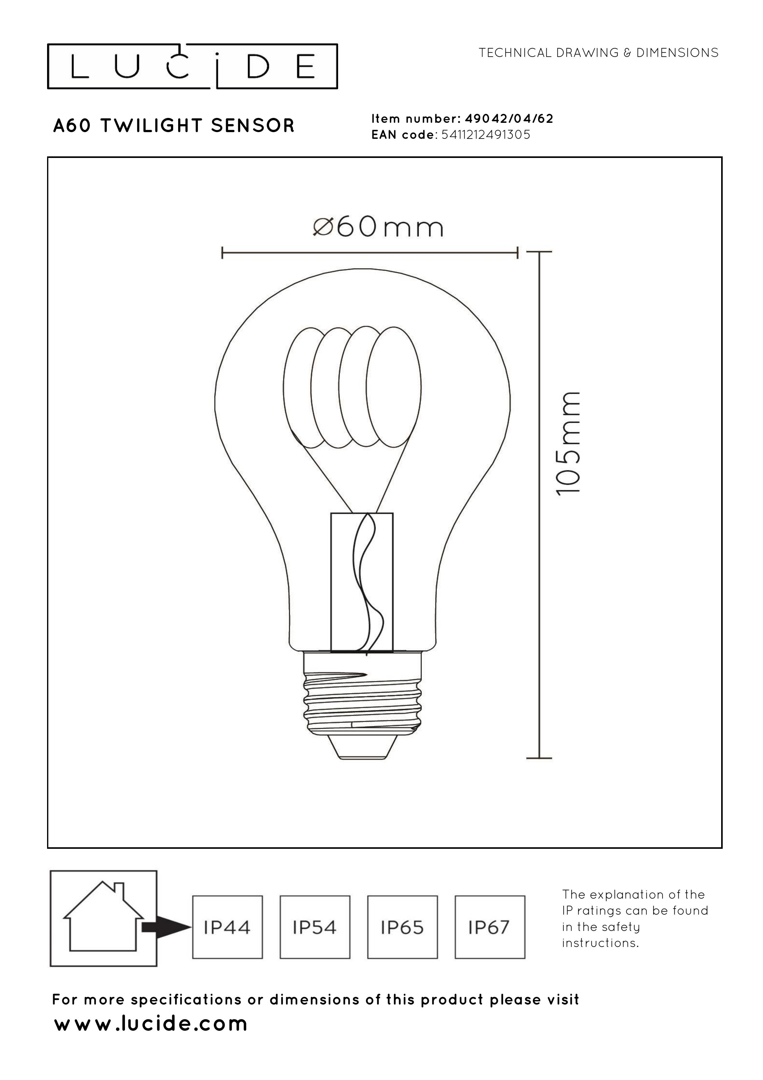 Lucide A60 TWILIGHT SENSOR - Lámpara de filamento - Ø 6 cm - LED - E27 - 1x4W 2200K - Sensor día/noche - Ámbar