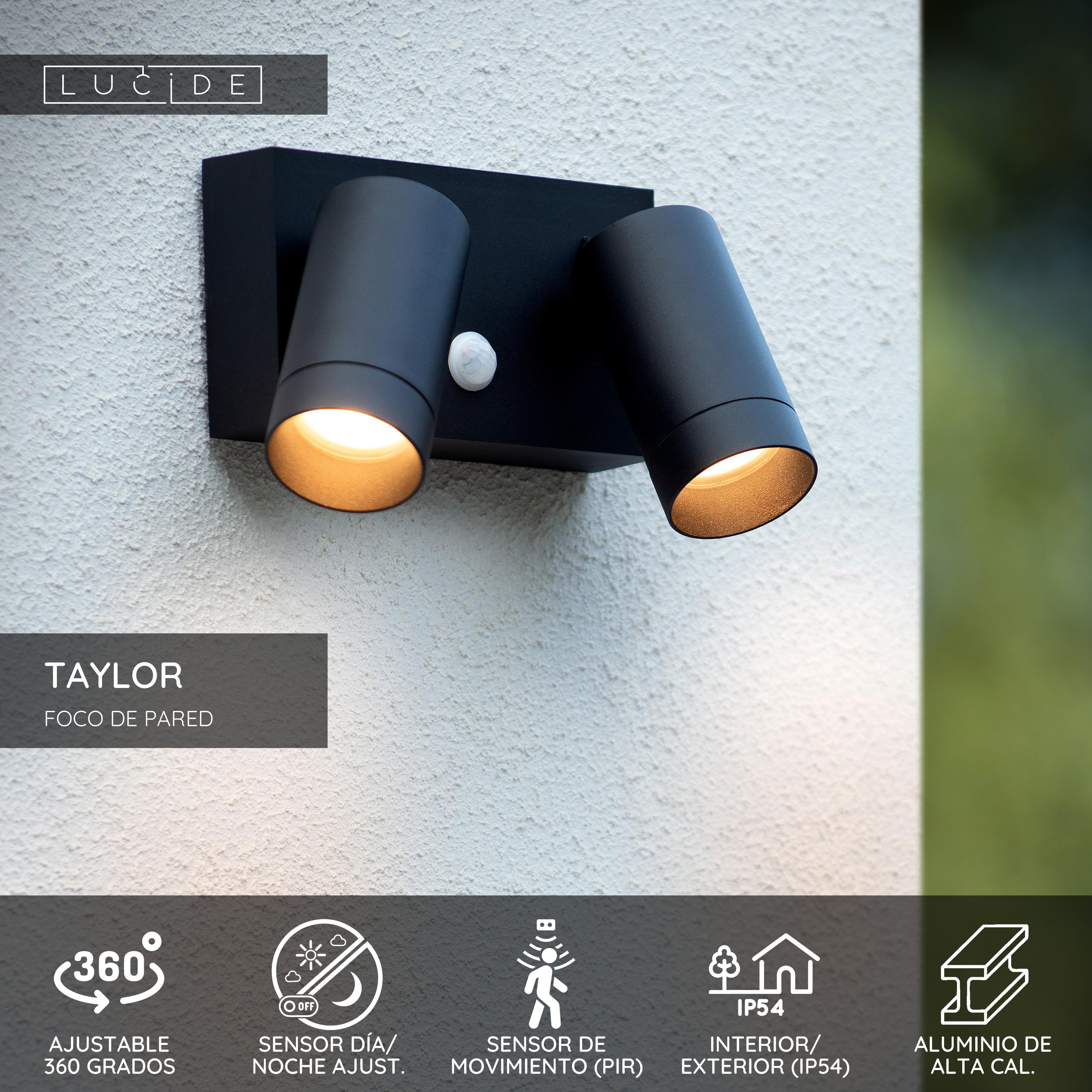 ¿Buscas una iluminación de exterior con un diseño potente, novedades tecnológicas y una calidad de confianza? Taylor reúne todas esas cualidades en un modelo de estilo moderno y atemporal. Este foco de pared, fabricado en aluminio de alta calidad, dispone de dos fuentes de luz y se puede colocar en una fachada de exterior con total seguridad. Sus materiales han sido elegidos cuidadosamente para garantizar un uso duradero y seguro en zonas al aire libre. Puedes rotar e inclinar los focos hasta que estén en la posición correcta. Gracias al sensor de movimiento sutilmente integrado en la luminaria, Taylor también resulta muy económico, ya que solo se enciende cuando es realmente necesario.