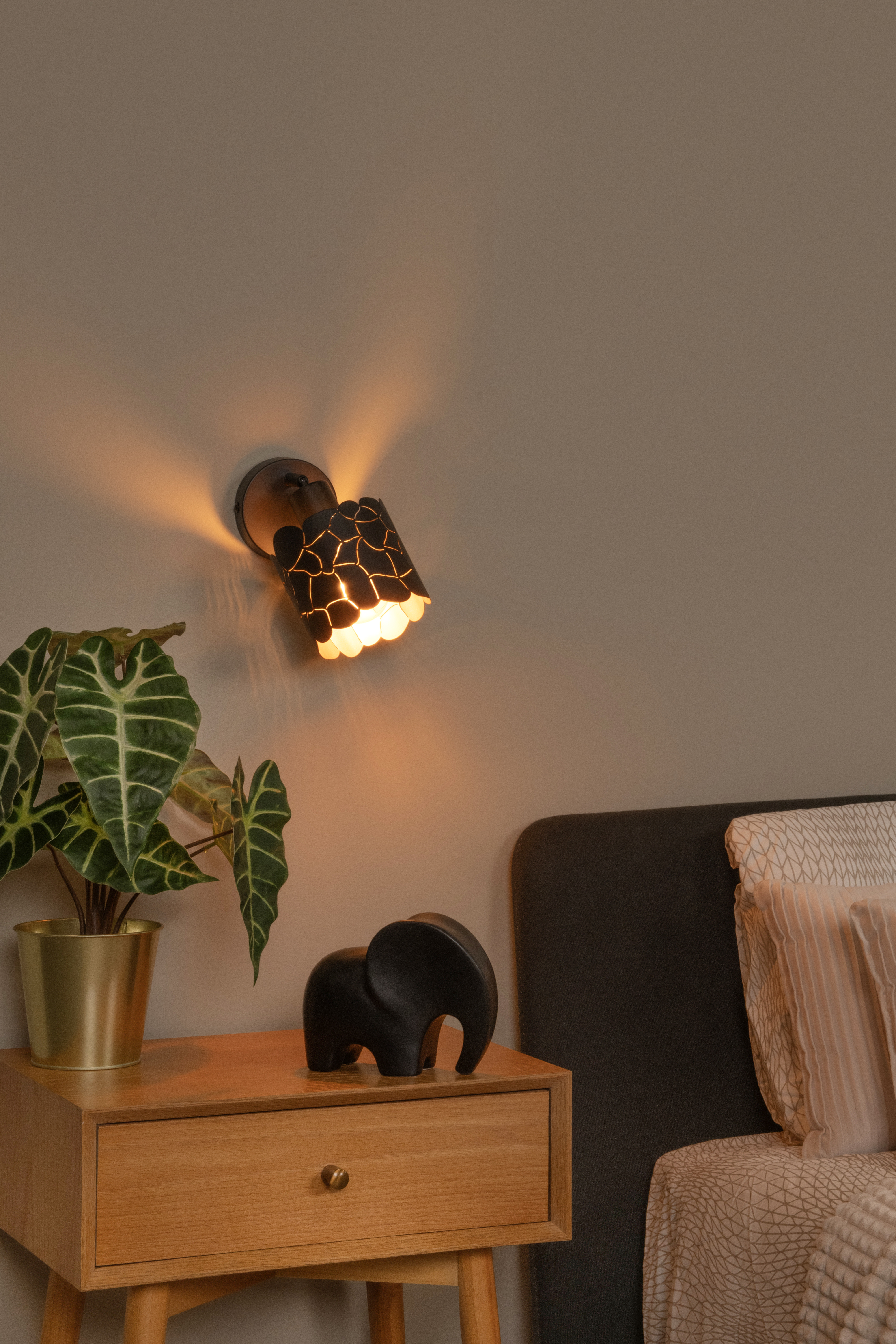 Una foco de pared no tiene por qué ser aburrido. Almelo es la prueba de ello. Este foco de pared tiene una llamativa pantalla metálica decorada con un estampado de jirafa. Con un interior dorado y una estructura de líneas abiertas, la luz se difunde alegremente, creando un ambiente encantador. Almelo es lo suficientemente versátil como para realzar casi cualquier espacio, desde el pasillo hasta el dormitorio. Además, puede conectarse fácilmente a un regulador de intensidad externo para aumentar el confort de la iluminación, que se puede personalizar inclinando el foco de pared a voluntad. Este foco mide 20 centímetros de alto y 12 centímetros de ancho.