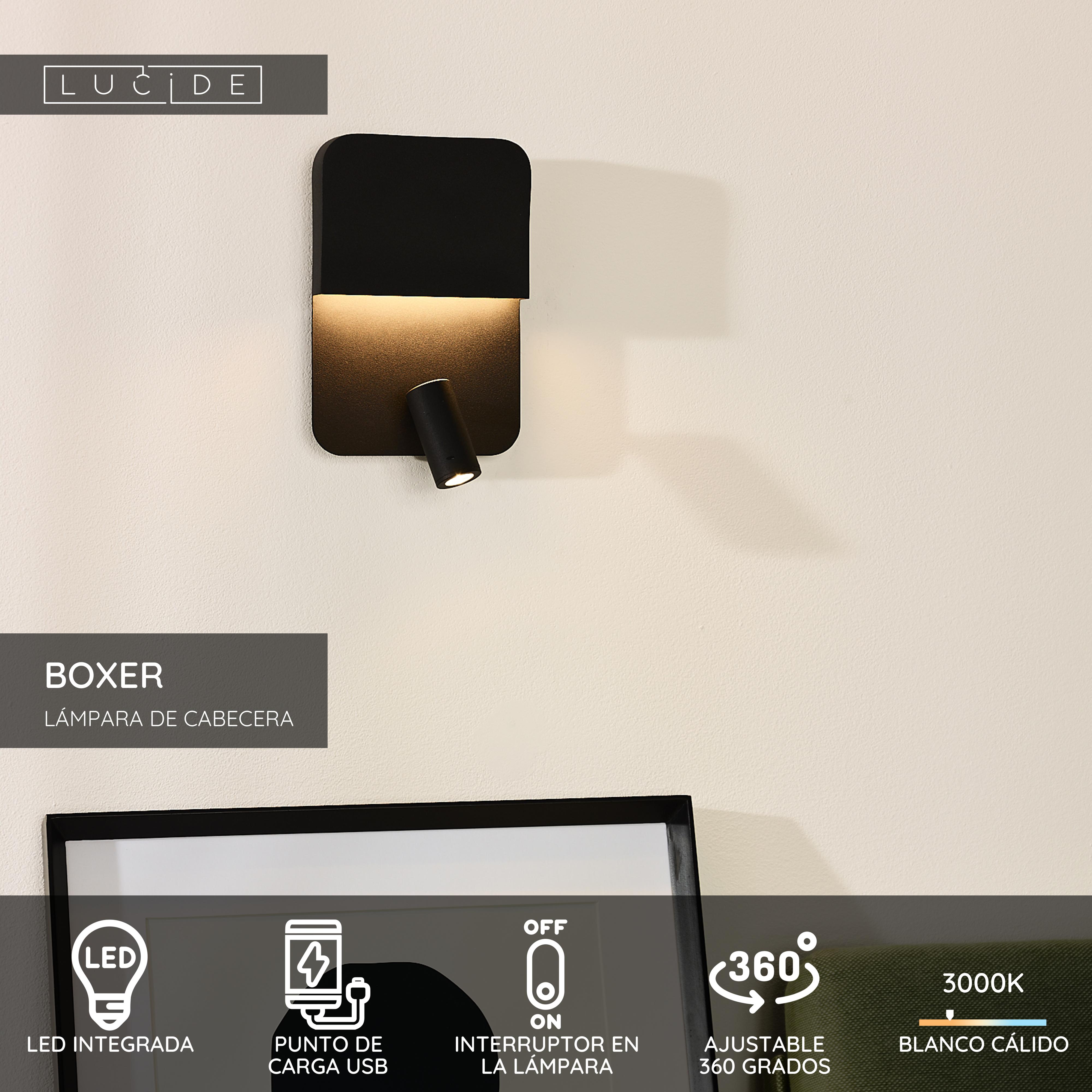 Lucide BOXER - Lámpara de cabecera / Lámpara de pared - LED - 3000K - Con punto de carga USB - Negro
