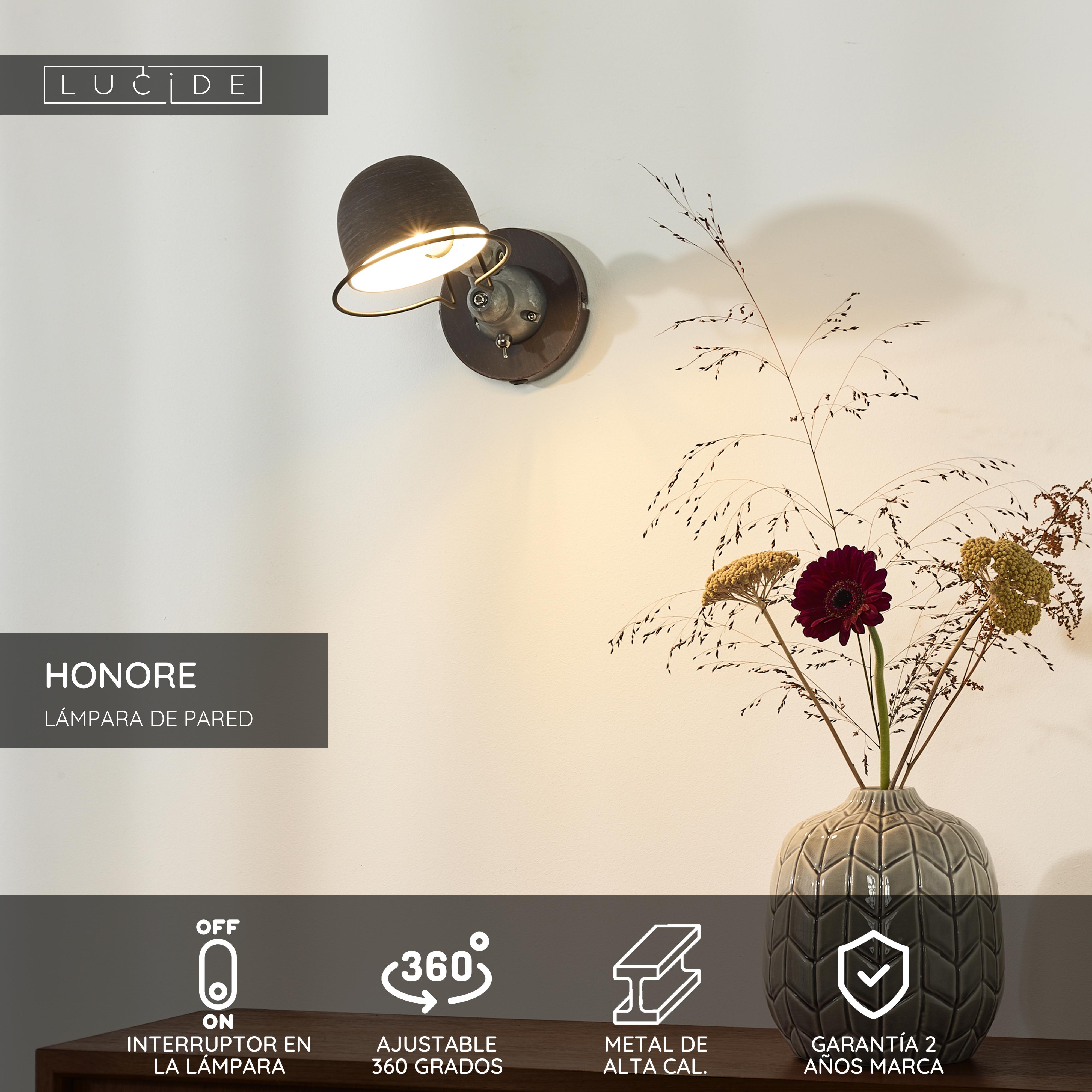 El aplique de pared Honore responde plenamente al ideario del estilo industrial. La elegancia de su diseño proviene en gran medida del aspecto metálico del armazón. Resulta ideal para poner una iluminación focal en tu recibidor, dormitorio o salón. Y gracias al práctico interruptor integrado en la armadura, tú decides cuándo necesitas Honore: de vez en cuando o toda la noche. Pero siempre dentro de los límites de un consumo energético limitado. ¿Cómo es eso posible? Gracias a que Honore es compatible con la iluminación led.