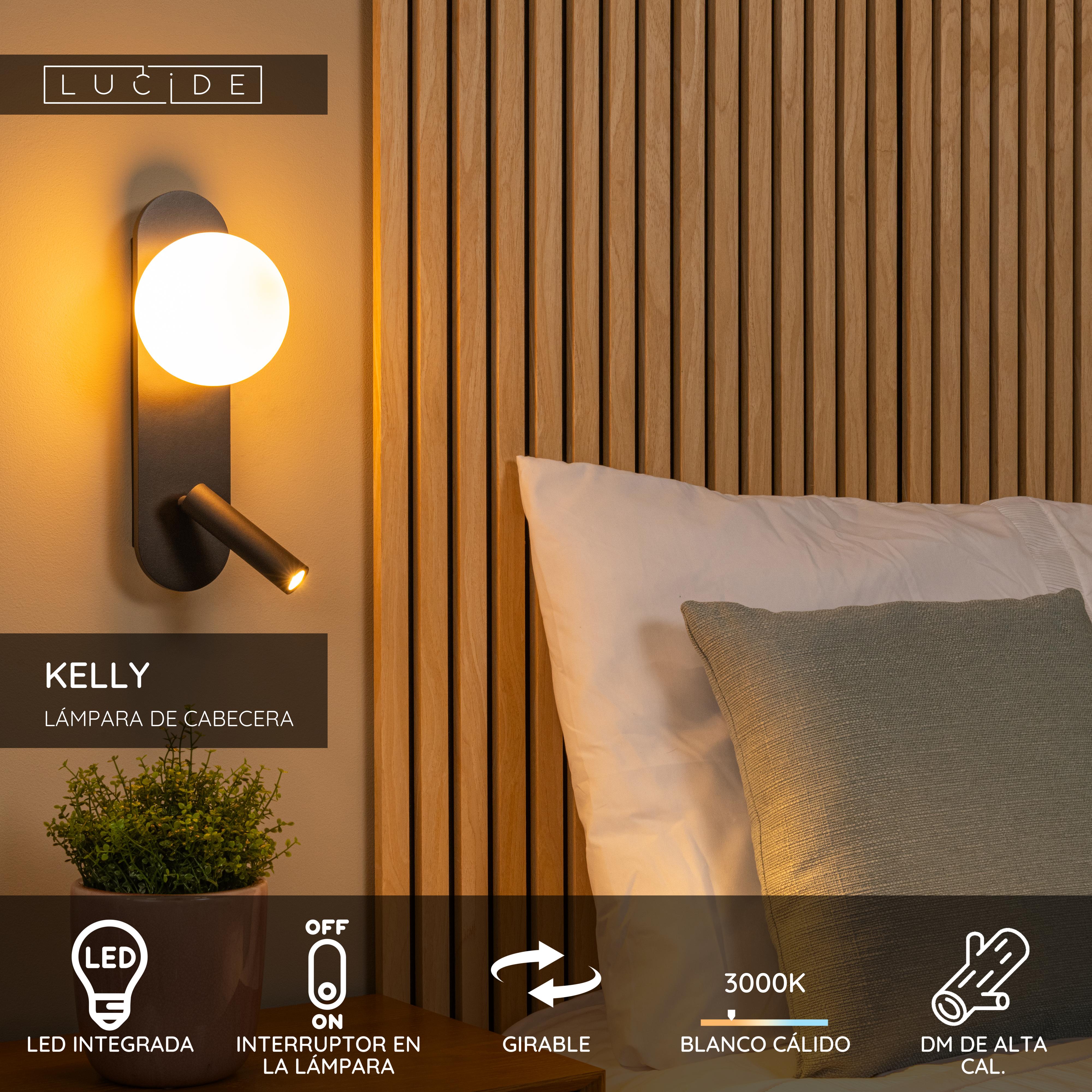 Si está buscando una lámpara de cabecera práctica y con un diseño elegante, Kelly es la solución. Esta lámpara de cabecera tiene dos fuentes de luz que pueden controlarse por separado mediante los interruptores laterales. Kelly combina una luz ambiental de cristal con un foco cilíndrico direccional sobre una base vertical de DM redondeada. Con Kelly, siempre tendrá la iluminación perfecta para su dormitorio. Esta lámpara de cabecera mide 32 centímetros de alto y casi 15 centímetros de ancho. Incorpora bombillas LED. Prepárese para unas veladas de lo más acogedoras.