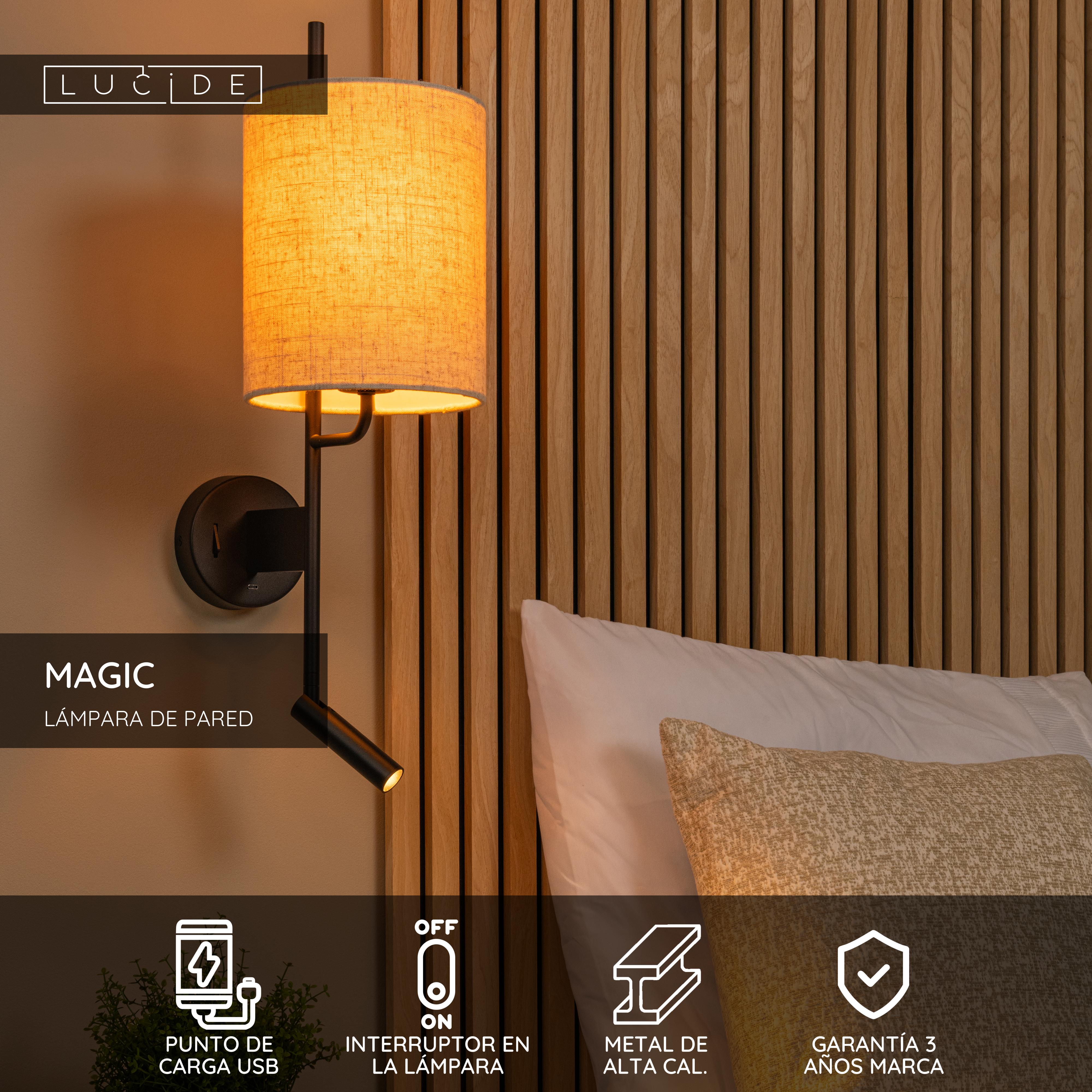 Lucide MAGIC - Lámpara de pared - 1xE27 - Con punto de carga USB - Negro