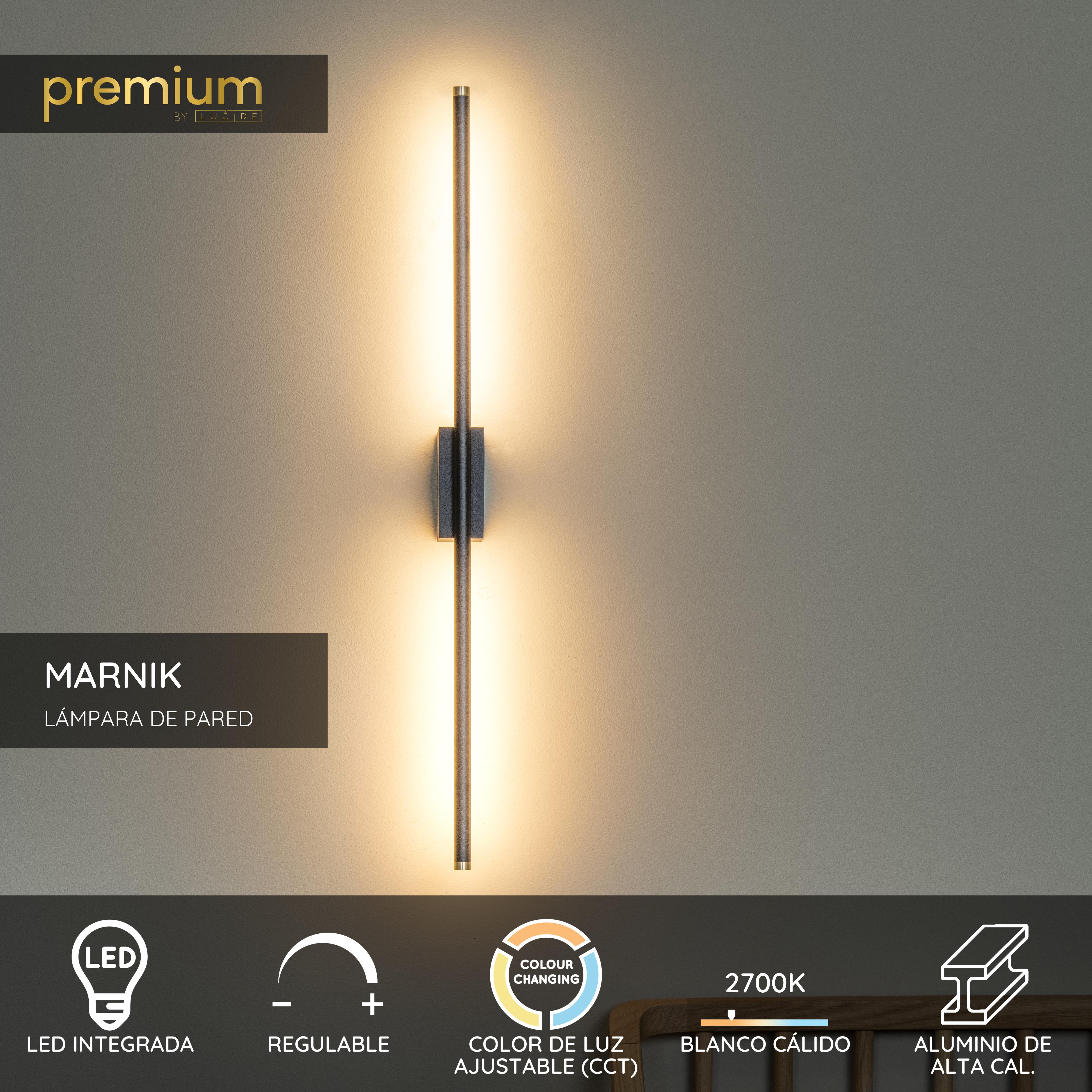 Añade un toque de lujo a tu interior con la lámpara de pared Lucide MARNIK de la colección Premium. Esta moderna y elegante lámpara de pared está fabricada en aluminio de alta calidad y cuenta con un sofisticado acabado negro con un sutil interior dorado. Con su diseño rectangular estilizado y su iluminación LED integrada, MARNIK ofrece una fuente de luz sutil pero impactante para salones, pasillos o dormitorios. Gracias a la temperatura de color ajustable (2700K-4000K) y la función de atenuación, fácilmente controlable mediante un sensor de movimiente de mano, puedes personalizar la intensidad y el ambiente de la luz según tus preferencias. Con una longitud de 59,1 cm, un ancho de 10 cm y una altura de 5 cm, esta lámpara de pared se adapta perfectamente a diversos estilos de interior. Disfruta de la combinación de tecnología avanzada y diseño refinado con la lámpara de pared Lucide MARNIK. ¡Pídela hoy mismo y mejora tu interior con una iluminación de alta calidad! Este producto no debe conectarse a un interruptor de pared y solo puede controlarse mediante los mandos integrados en el propio producto.